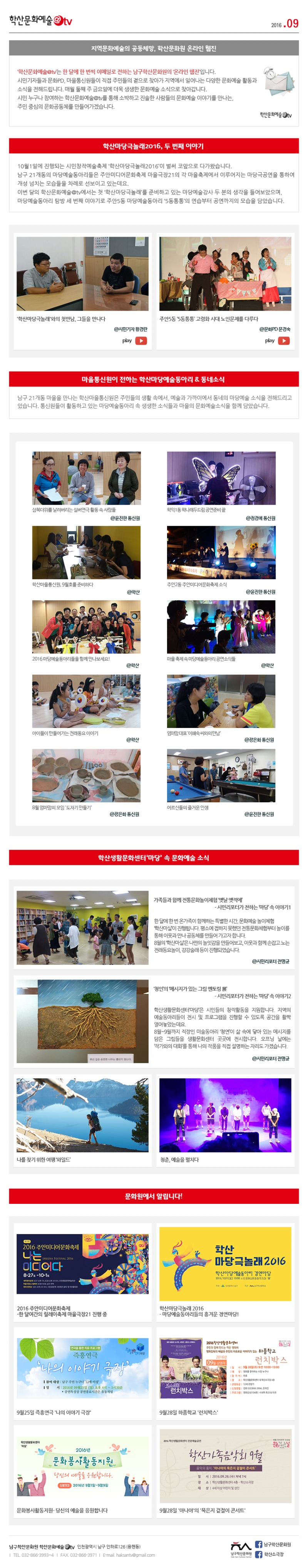 2016년 09월 웹진 admin 1 8651 2016-09-09 19:15:09 이전글 : 2016년 08월 웹진 다음글 : 2016년 10월 웹진 수정 삭제 목록 댓글목록 윤진한 2016-09-11 07:29:43 삼복(三伏)의 폭염(暴炎)을 멋지게 이겨내고 이렇게 알차고 멋진 소식 알려주는 웹진을 작성해낸 통신원, 마을지기 그리고 문화원 직원 모두가 수고하셨네요!주안 미디어축제도 성황리에 진행되고 우리 실버 연극 예술단도 열심히 연습에 충실하니 모두가 행복(幸福)한 여름 보내셨네요,중추절(仲秋節) 명절 가족과 화목하고 사랑으로 즐겁게 보내시고 복(福)많이 받으세요! 풍요(豊謠)로운 가을의 결실(結實)과 파란 하늘은 보너스!! ㅎㅎ 이름 비밀번호 등록