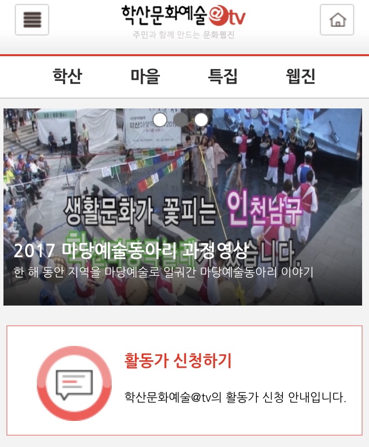 문자를 클릭해서 접속하면 아래 화면과 같이 학산문화예술@tv 를 만나 보실 수 있습니다~!