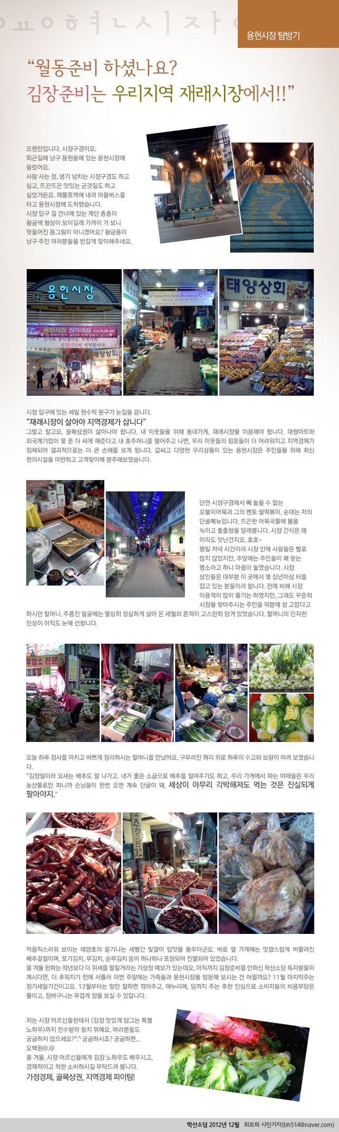 용현시장 탐방기 - 김장 준비는 재래시장에서 admin 0 11673 2012-11-30 10:00:30 이전글 : 마음을 두드리는 영화, 터치(Touch) 다음글 : 주민이 만드는 하품영화제 - 그 3일간 목록 댓글목록 이름 비밀번호 등록