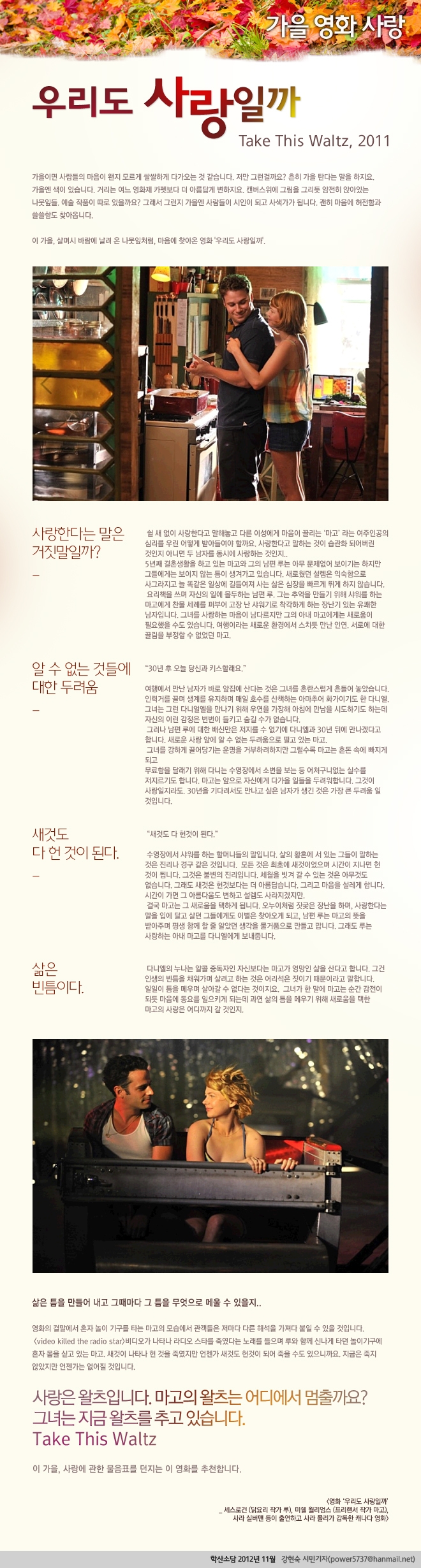 [2012년 11월호] 가을영화 사랑- 우리도 사랑일까 admin 0 12022 2012-11-01 10:00:16 - 이전글 : 봄바람을 타고 온 시네마 - 영화공간주안 3월 상영 예정작 다음글 : Mr 옹을 찾아라! 목록 댓글목록 이름 비밀번호 등록