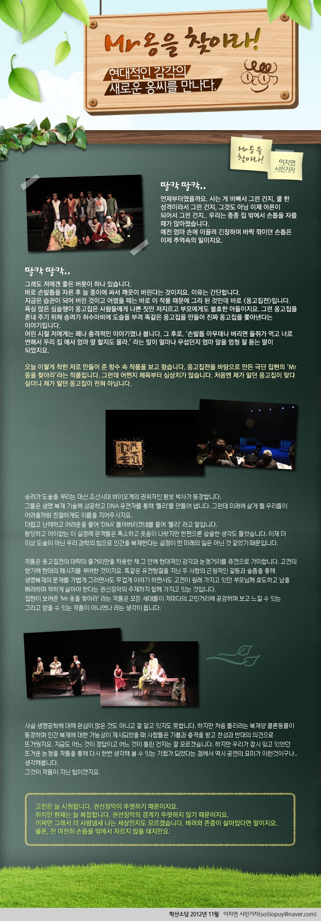 Mr 옹을 찾아라! admin 0 11527 2012-11-01 10:00:26 - 이전글 : [2012년 11월호] 가을영화 사랑- 우리도 사랑일까 다음글 : 실버극단, 소무의도를 가다 목록 댓글목록 이름 비밀번호 등록