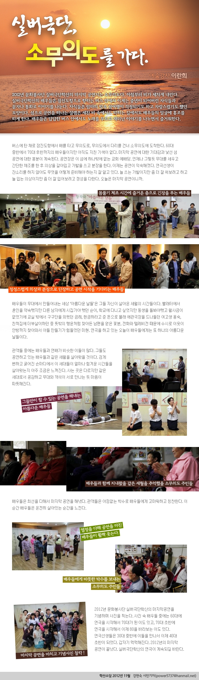 실버극단, 소무의도를 가다 admin 0 11351 2012-11-01 10:00:01 - 이전글 : Mr 옹을 찾아라! 다음글 : 제9회 하품영화제 '그 여자, 이야기' 목록 댓글목록 이름 비밀번호 등록