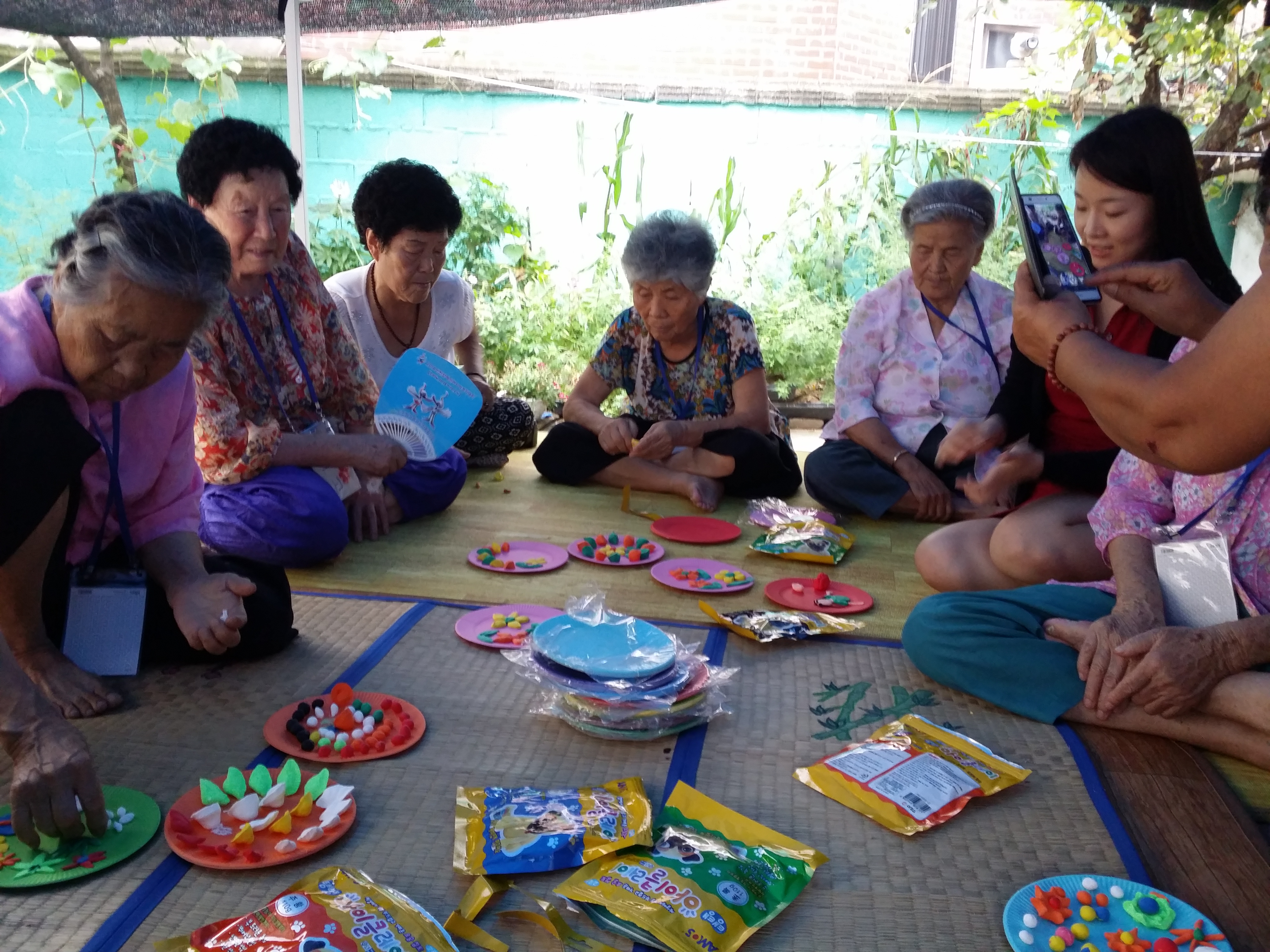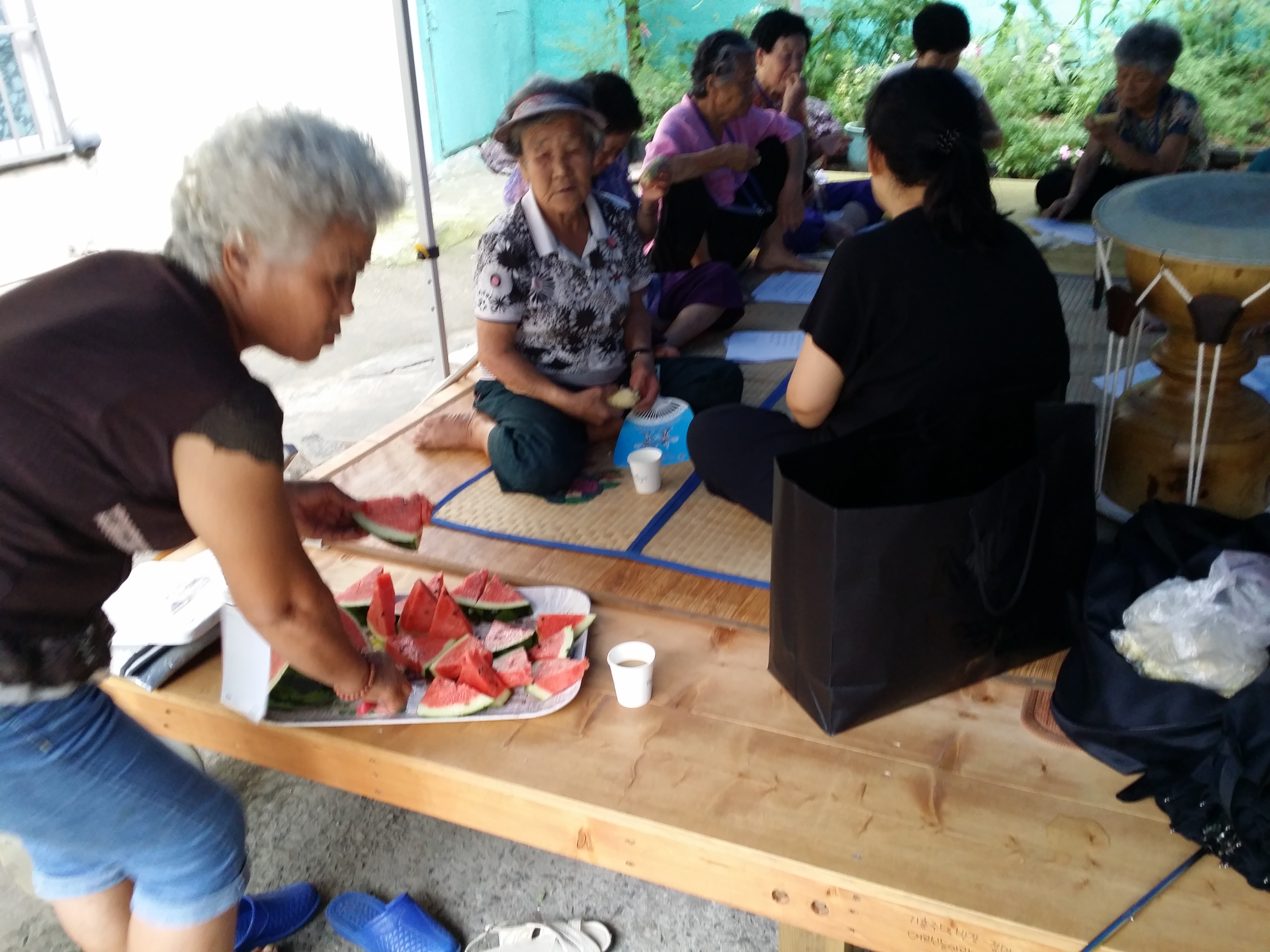 여기 통장님의 노래 실력이 매우 뛰어나신데요, 맛있는 간식 수박, 옥수수, 시원한 다방 커피를 통 크게 준비해 오셨답니다. 열심히 집중하고 만들기 수업을 마치신 할머님들도 아주 맛있게 드셨답니다. 쉬는 동안 평상위에선 할머님들의 정보 교환이 이루어 졌습니다. 이가 약해져 음식을 잘 먹지 못한다는 이야기, 올해 고추 값이 얼마나 하는지, 매일 빠짐없이 동네 쓰레기봉투를 치우시는 연렬 할머니 칭찬, 감사하다는 인사도 잊지 않으셨답니다.