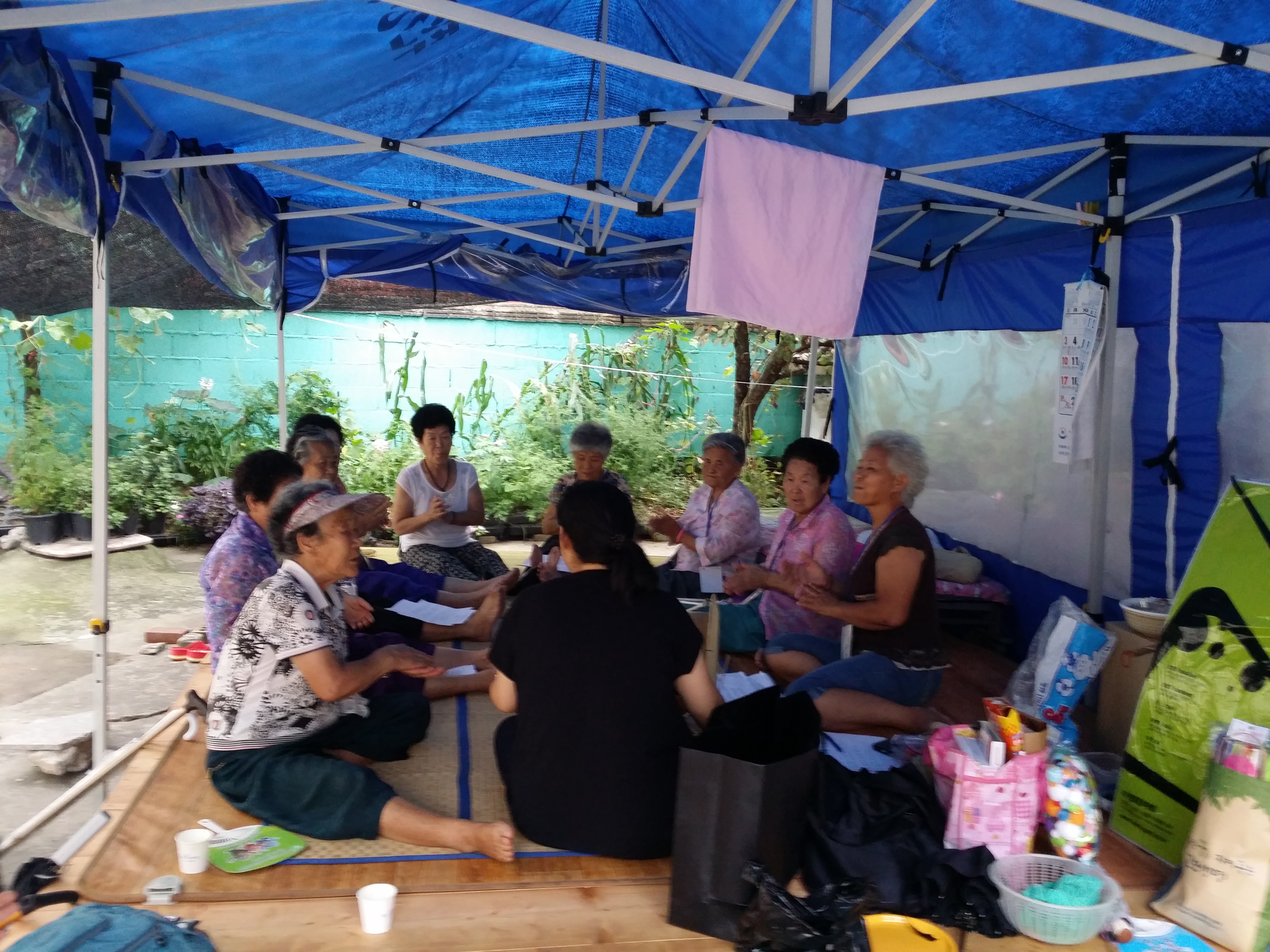 이 곳 기흥마당의 평상은 그냥 평상이 아닌 것 같습니다. 아침에 눈뜨면 누가 부르지 않아도 할머님들은 이곳에 모이 십니다. 앉았다, 누웠다, 맛있는 음식 싸와서 나눠 잡수시고, 두런두런 수다도 떨고. 동네 소식도, 옆집 언니 소식도 여기에 있으면 알음알음 알 수가 있죠. 처음 맨 땅에 돗자리만 깔아 있던 장소가 통장님과 구청, 선생님의 도움으로 사랑방 분위기를 물씬 풍기는 평상이 놓이게 되었답니다. 파란 천막이 뜨거운 해를 가려주고 비가와도 평상위에 앉아 있으니 걱정이 없습니다. 대부분 혼자 살고 계시는 할머님들, 젊은 사람들이야 찾는 이도 있고 찾아 만날 사람도 있을 테지만 어르신들의 하루 일과라는 것이 큰 변화 없는 오늘이 내일이고 내일이 오늘인 하루일 테니까요. 일주일에 한번 모이는 이시간은 할머님들에게는 아주 소중하고 즐거운 시간일 것입니다.