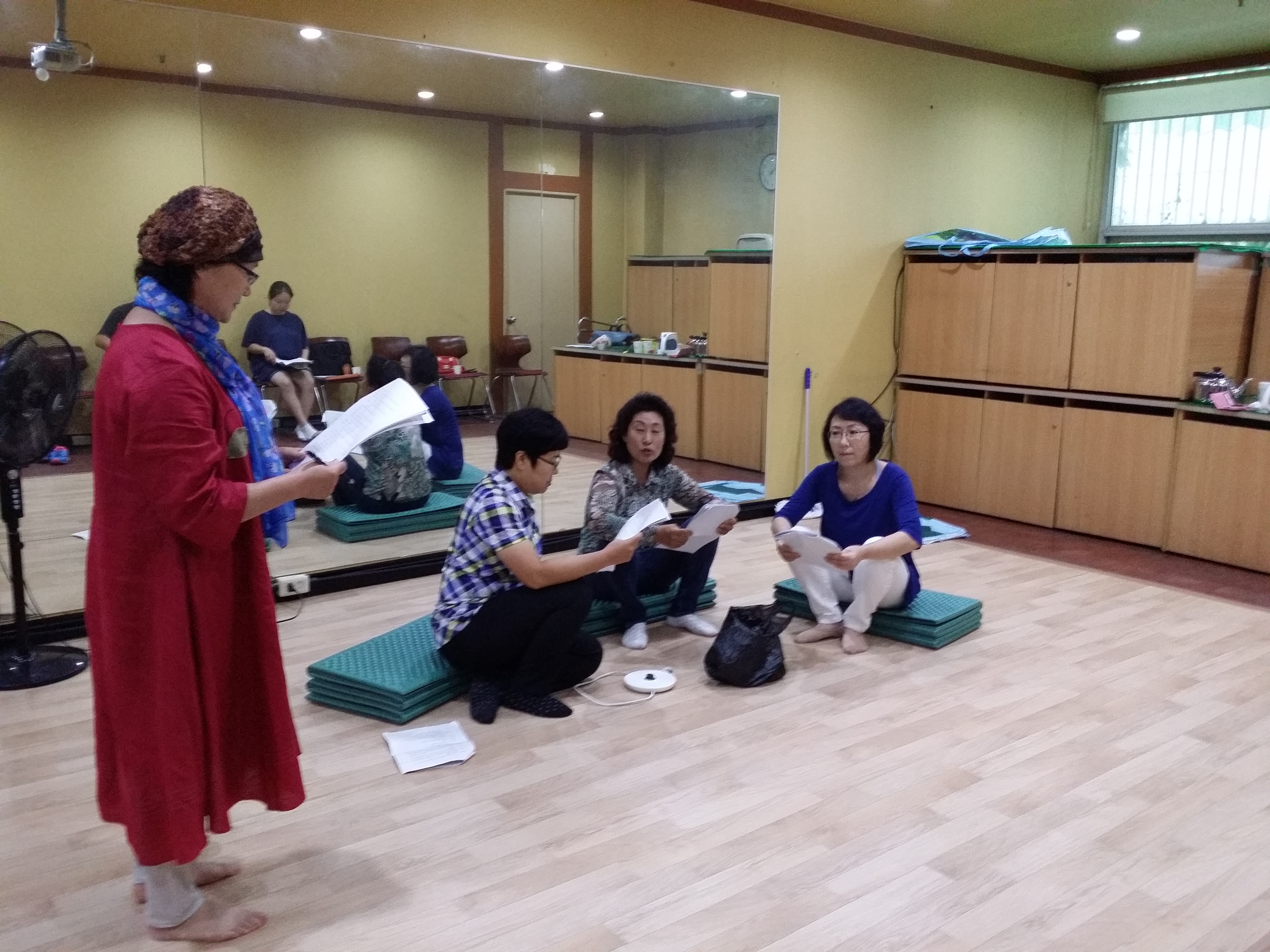 술 취한 역을 맡으신 양문선 언니(빨간 옷) 동네 아주머니 역에 정민언니(파랑체크남방), 호프집 여사장역에 숙자씨(파랑블라우스), 부동산 여주인역은 수경언니(머리띠), 각자 캐릭터들의 특징과 성향을 살리려고 같은 대사를 여러 번 반복하면서 시간 가는 줄 모르고 열심히십니다.^^