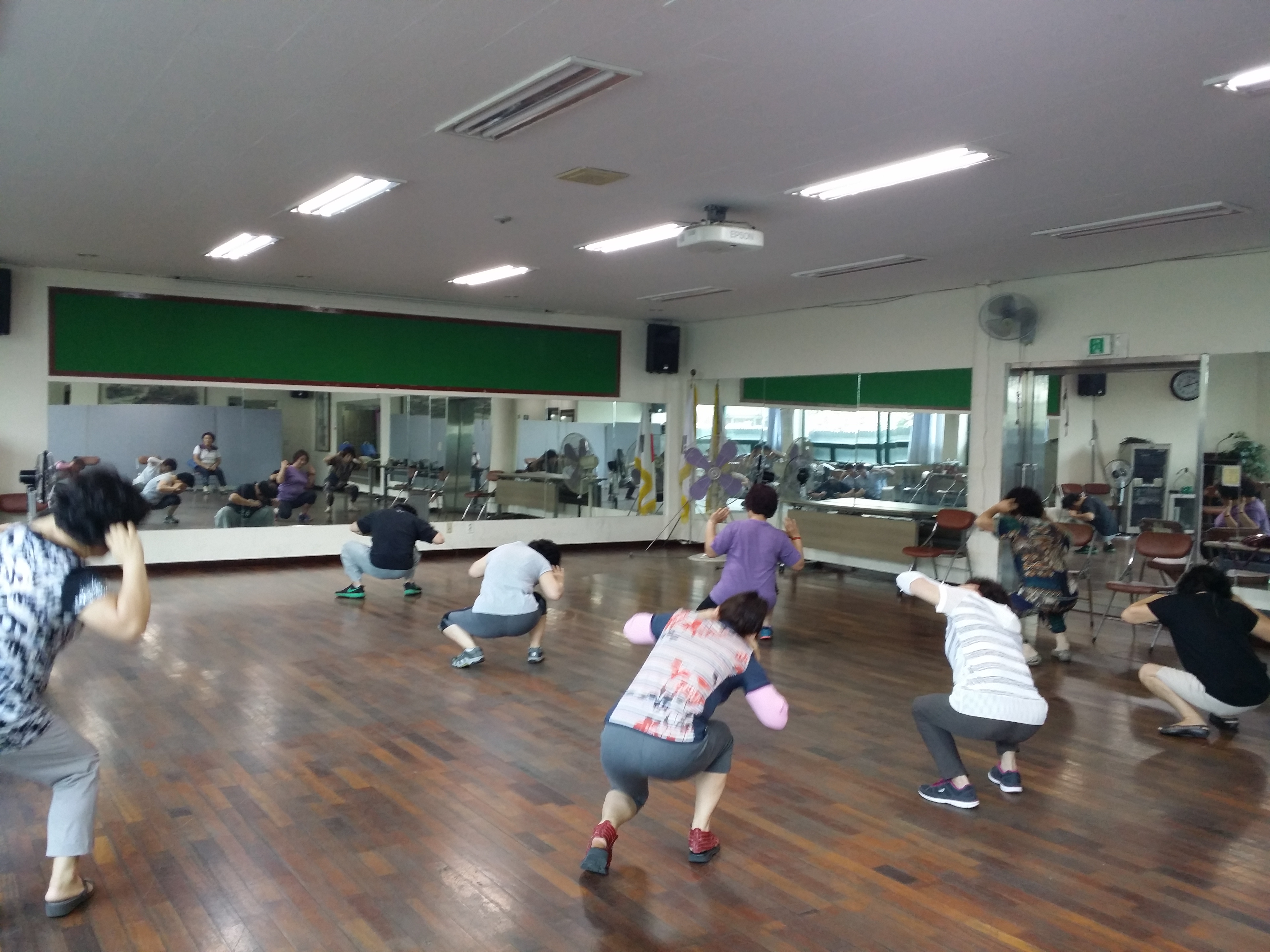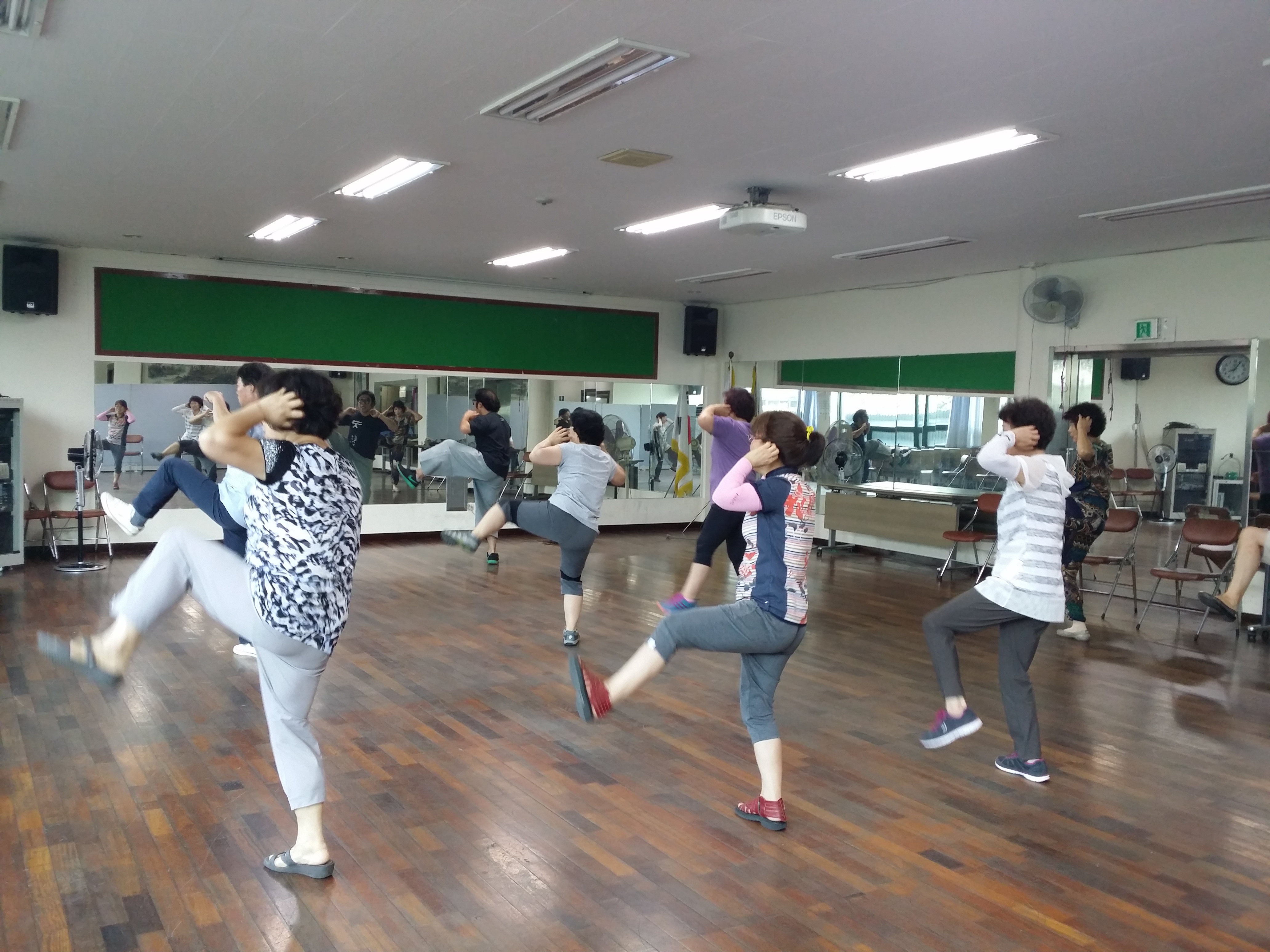 그러나 말처럼 동작이 쉽지는 않습니다. 멋진 폼을 자랑하는 선생님과 달리 우리 통장님들의 폼은 영 엉성합니다. 역시 연습이 유일한 방법이겠죠. 한 번, 또 한 번 반복하다 보면 내가 아니라 내 몸이 스스로 입 장단에 맞추어 자동으로 들썩 들썩 하겠죠?