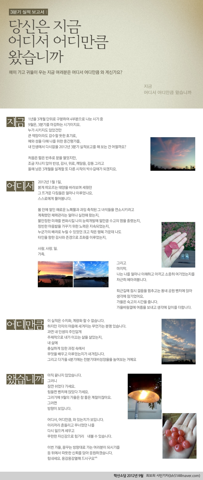 당신은 지금 어디서 어디만큼 왔습니까 admin 0 11934 2012-09-04 10:00:23 이전글 : 2012 주안미디어문화축제에 美치다 다음글 : 학산 문화원과 함께 한 역사 기행 목록 댓글목록 이름 비밀번호 등록