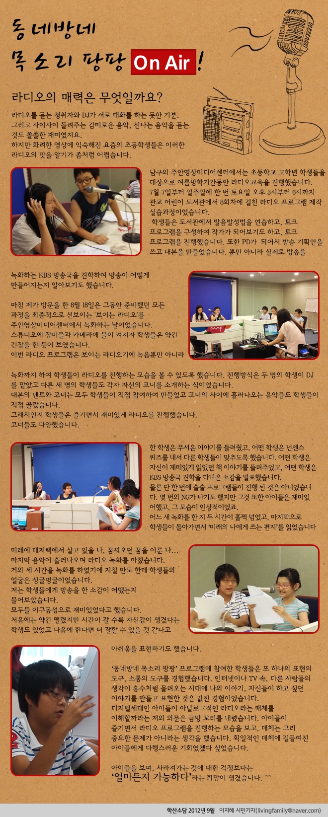 동네방네 목소리 팡팡 On Air, 라디오의 매력 admin 0 11193 2012-09-04 10:00:00 이전글 : 2012 학산 작은 배우 아카데미 다음글 : 대관령 옛길 목록 댓글목록 이름 비밀번호 등록