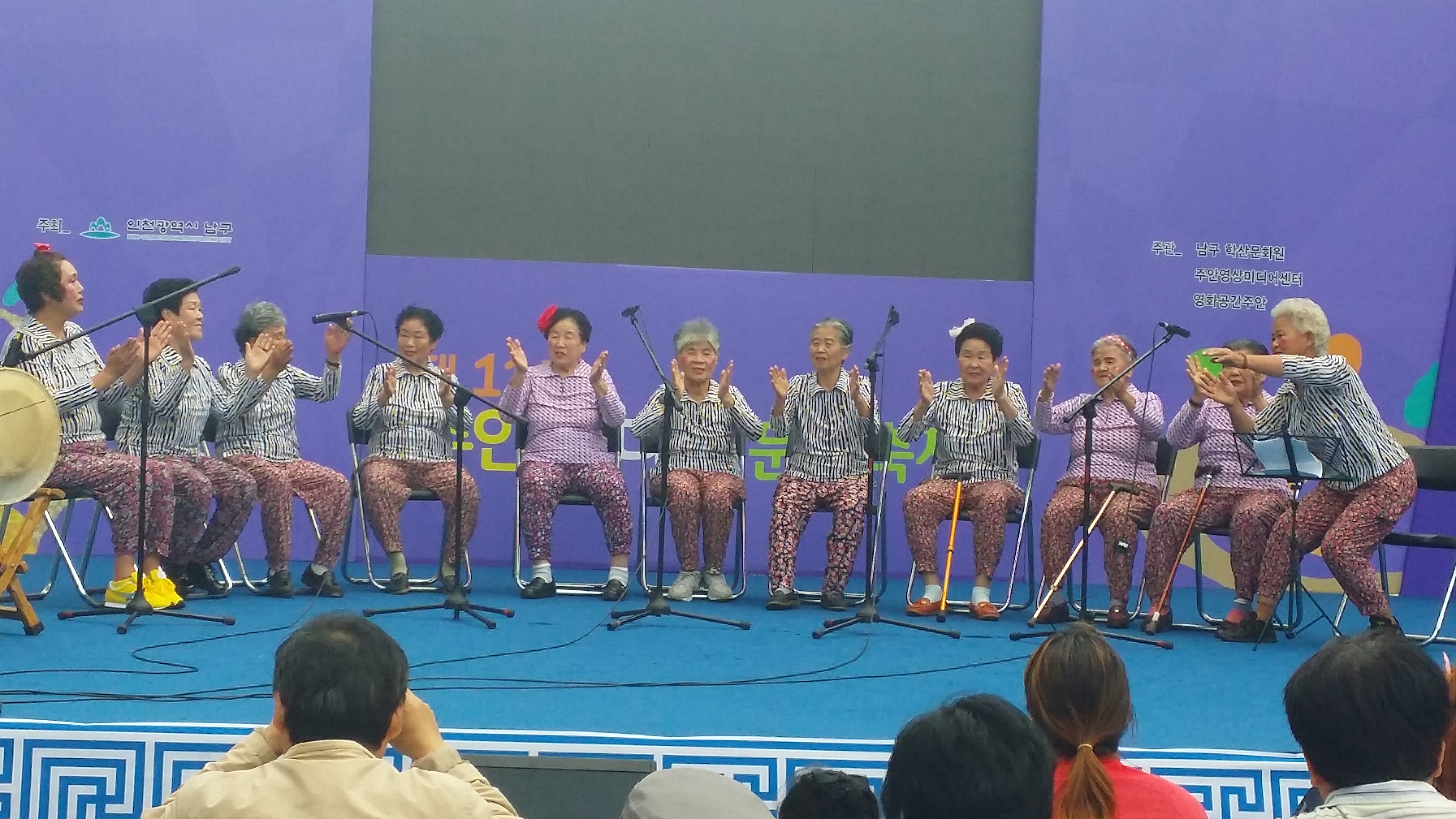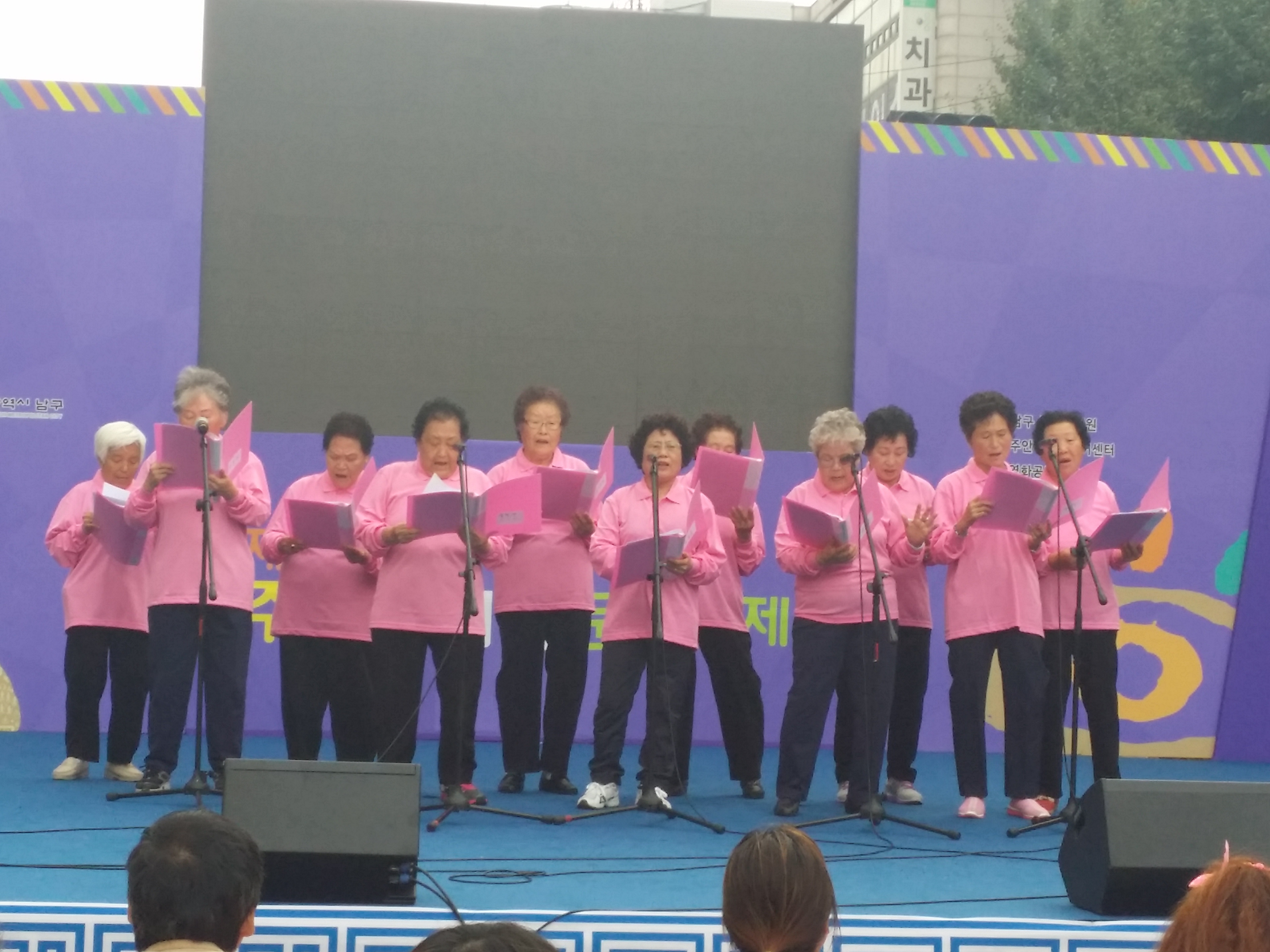 20140927_161836그리고 이어진 두 번째 무대, 주안3동 기흥마당 어르신들이 노래를 부르셨답니다. ‘너의 이름이 무엇이냐?’ ‘나의 이름은 순자라오!’ 태평가를 개사했는데요, 곤지 연지 바르고 꽃무늬 바지를 통일해서 입으신 모습이 귀여워서 일까요? 객석에서 박수갈채가 쏟아졌답니다.