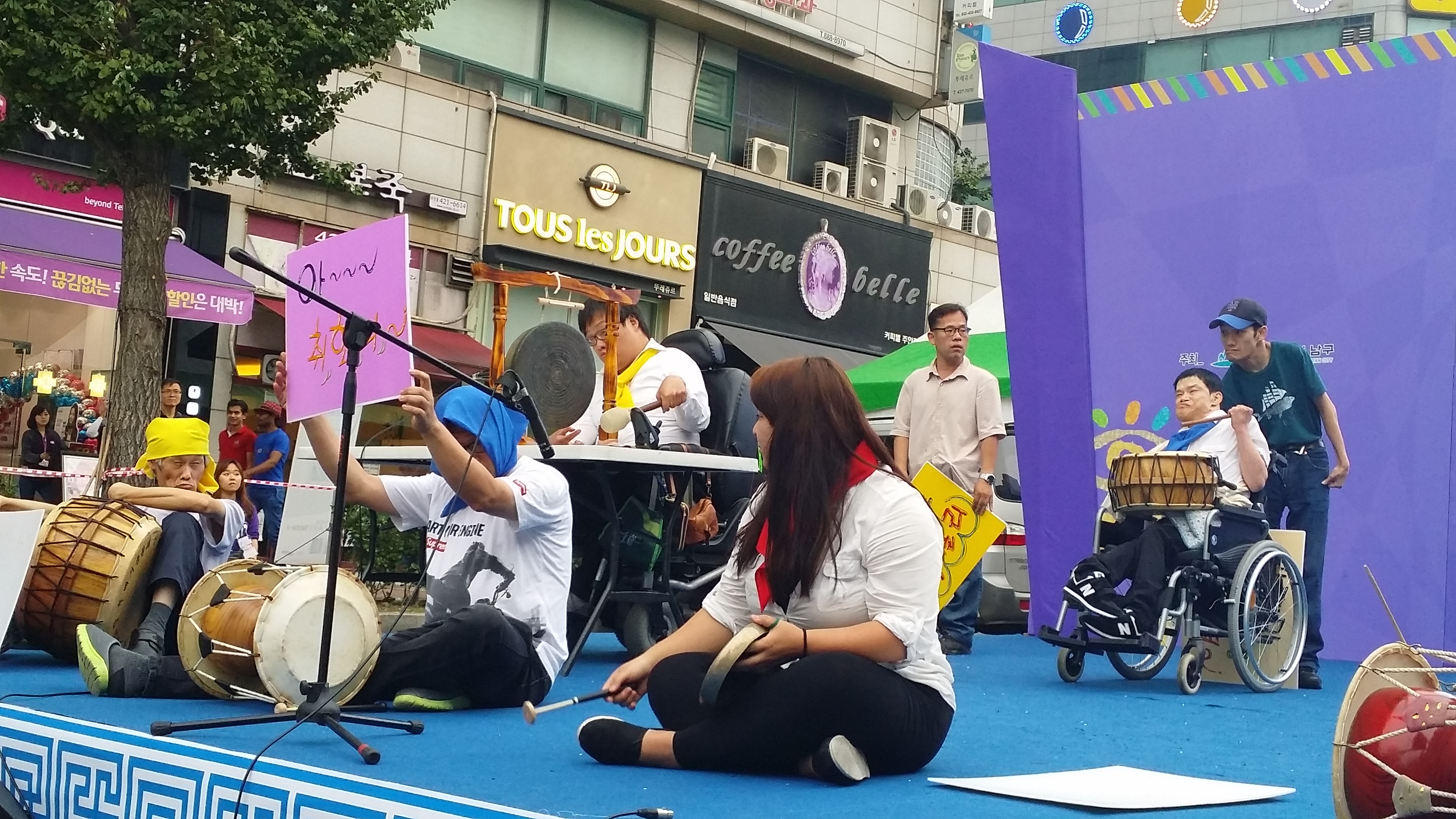 SAMSUNG DIGITAL CAMERA주안 5동 바래미팀입니다. 뇌병변1급 장애를 가진 분들이 공부를 하는 곳 바래미 야학에서 사물놀이를 배워 이번 축제에 참여를 하게 되었답니다. 학산문화원 직원들이 무대에 오르는 것을 도와주고 있는 모습입니다.