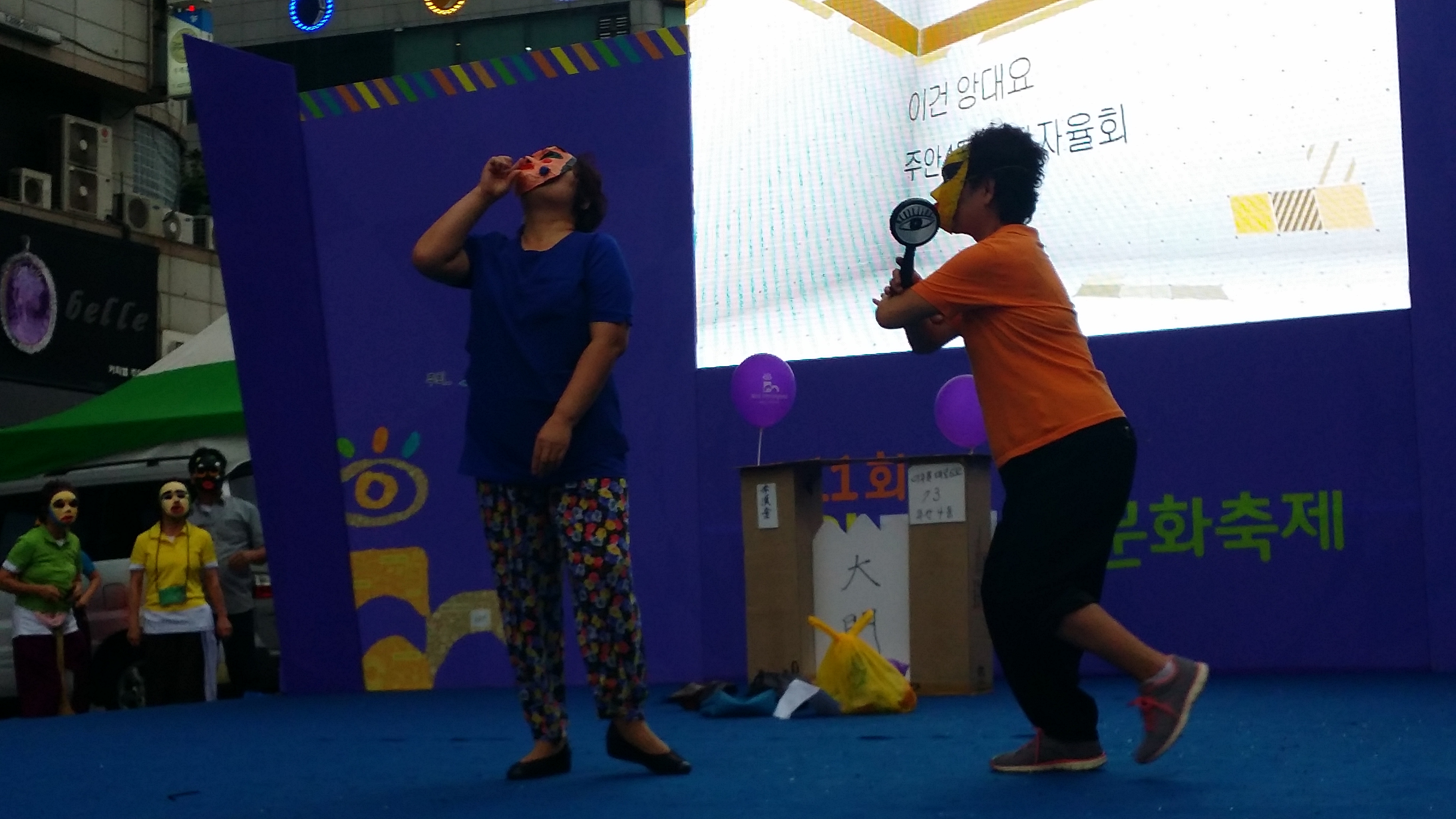 20140928_174809주안 4동 통장님들도 쓰레기 분리수거에 대한 마당극을 봉산탈춤과 함께 공연 했습니다. 쓰레기를 몰래 버린 주민과 몸싸움을 하고 있는 모습이랍니다. 실감나는 연기였죠.