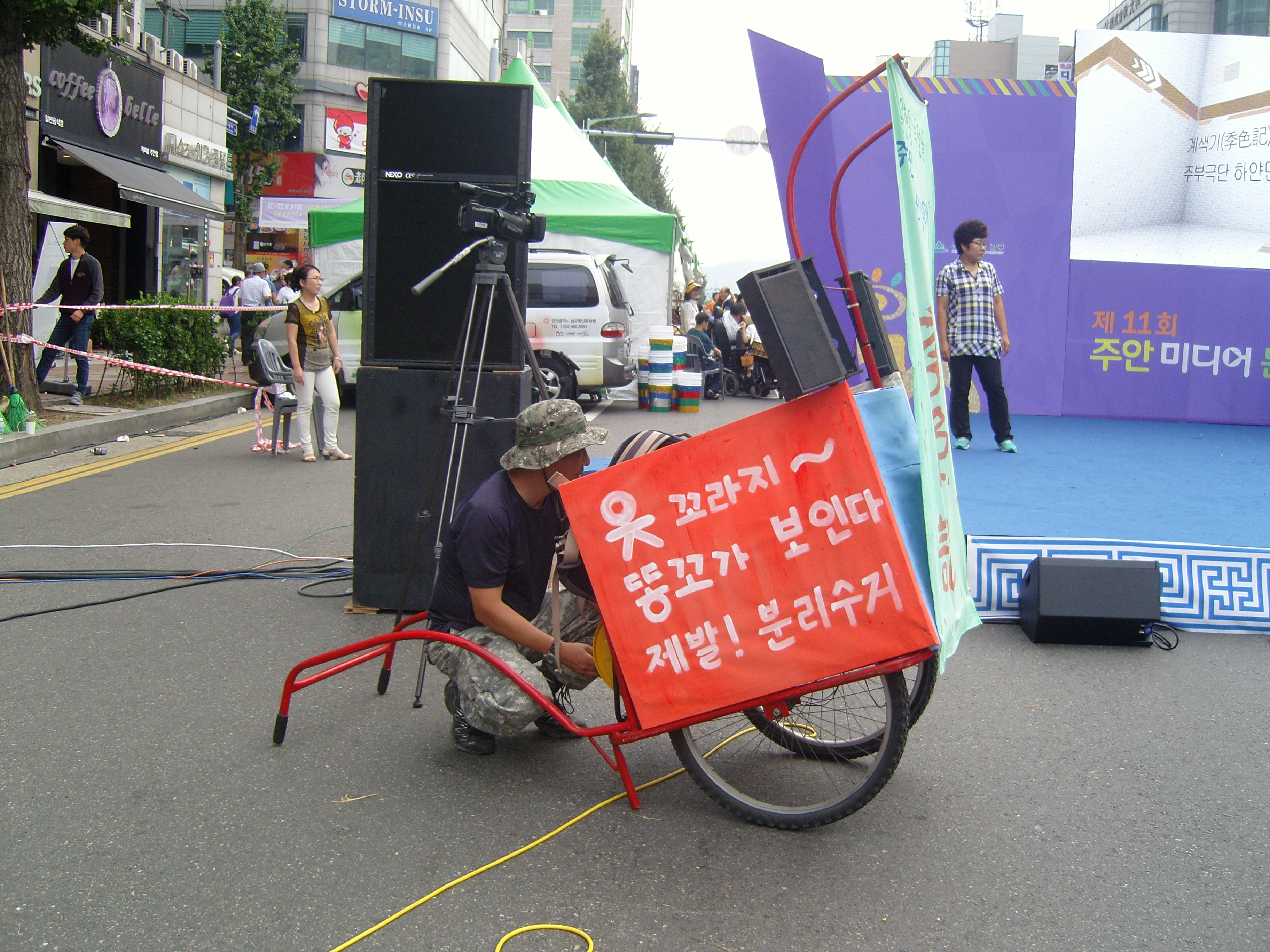 SAMSUNG DIGITAL CAMERA주부 극단 ‘하얀민들레’ 팀입니다. 인하대 문화의 거리에서 있었던 일을 극으로 만들어 연기했답니다, 극단 여러분이 직접 만든 리어카인데요, 리어카에 쓰인 글은 극중 호프집 여주인이하는 대사랍니다. 김종현 선생님께서도 함께 출현을 했답니다.
