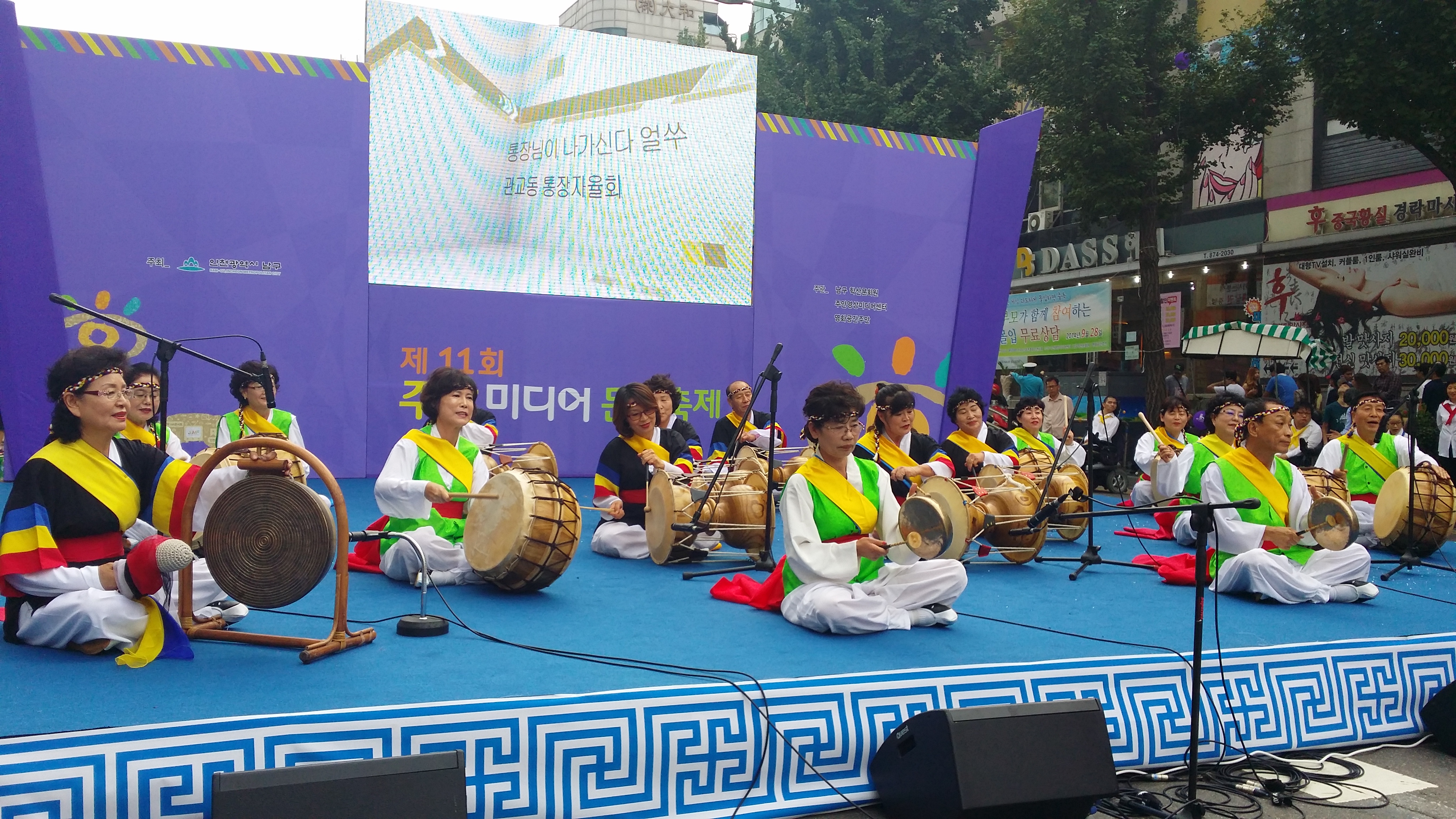 9월 28일 일요일, 사물놀이패에 어울리는 의상을 갖춰 입고 첫 순서로 무대에 오른 통장님들은 신명나게 한판 잘 놀고 공연을 무사히 마쳤다.