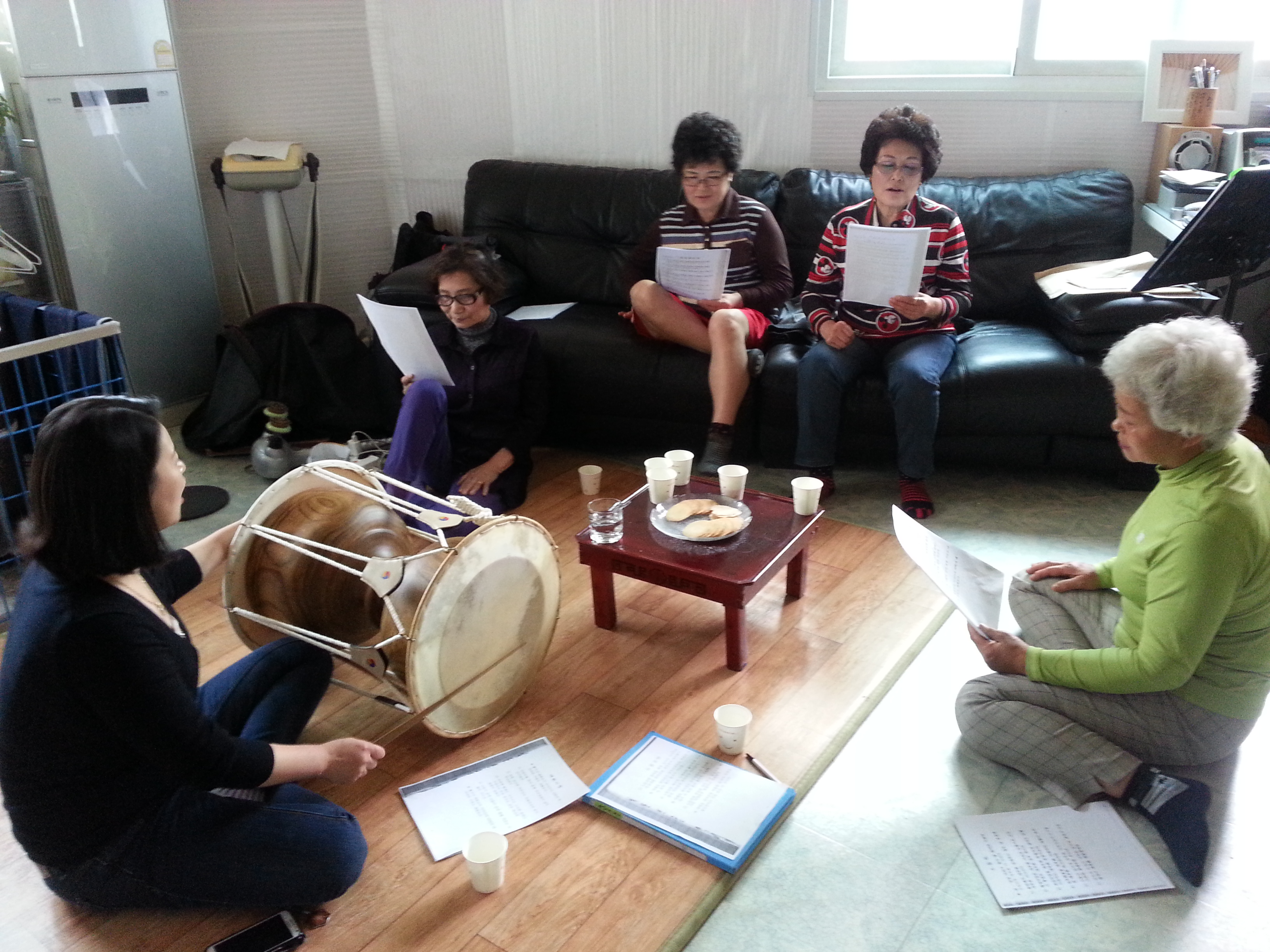 마을 일에 열심히 이신 통장님. 미국여행갔다 돌아오신 분. 슈퍼 잠시 닫아놓고 오시는 분. 벼락맞은 이야기로 방송국이랑 인터뷰하신다는 분 여러 개성 넘치는 분들이 모여 함께 민요를 배우고 있습니다.