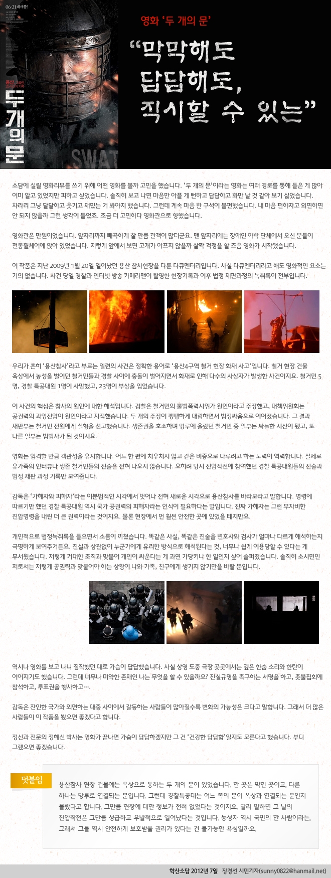 '두개의 문' - 막막해도 답답해도, 직시할 수 있는 admin 0 11390 2012-07-02 10:00:16 - 이전글 : 괜찮아, 침대가 흔들려도 다음글 : 칼국수집 할머니 목록 댓글목록 이름 비밀번호 등록