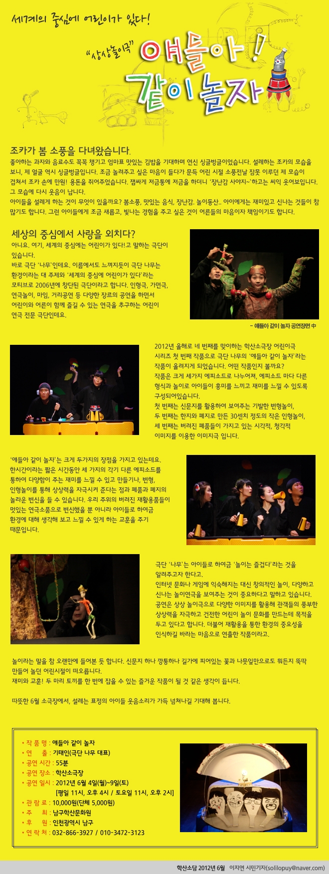 얘들아! 같이 놀자 [상상놀이극] admin 0 10977 2012-06-05 10:00:30 - 이전글 : 인천 여덟 빛깔 문화원 꽃을 피우다 心心FreeDay 다음글 : 쉿! 몸으로 말해보는 마임 한마당! 목록 댓글목록 이름 비밀번호 등록