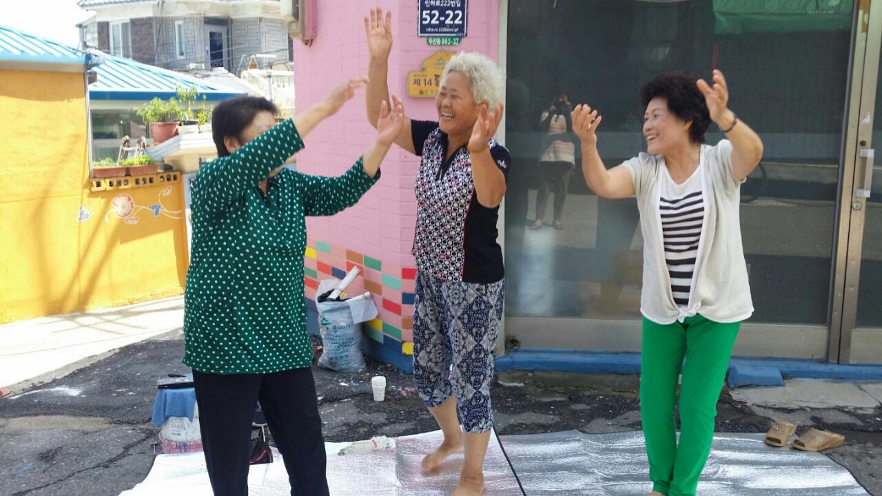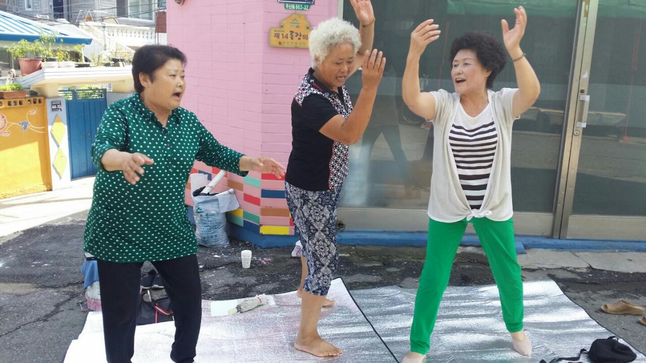 우리는 길거리로 나와서 연습을 하였어요 용기를 내기 위해서... 차들이 지나가고 사람든이 쳐다 보았지만 아랑곳 하지않는 용감한 대한민국 아짐씨들^^