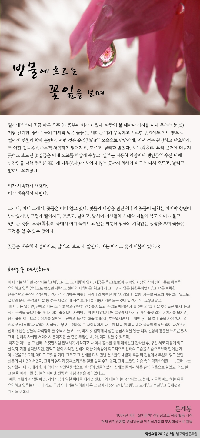 빗물에 흐르는 꽃잎을 보며 admin 0 11424 2012-05-02 10:00:09 - 이전글 : 다름은 곧 관심의 시작이다 다음글 : 내 삶을 바꿔줄 '결정적 한방'은? 영화 '이민자' 목록 댓글목록 이름 비밀번호 등록