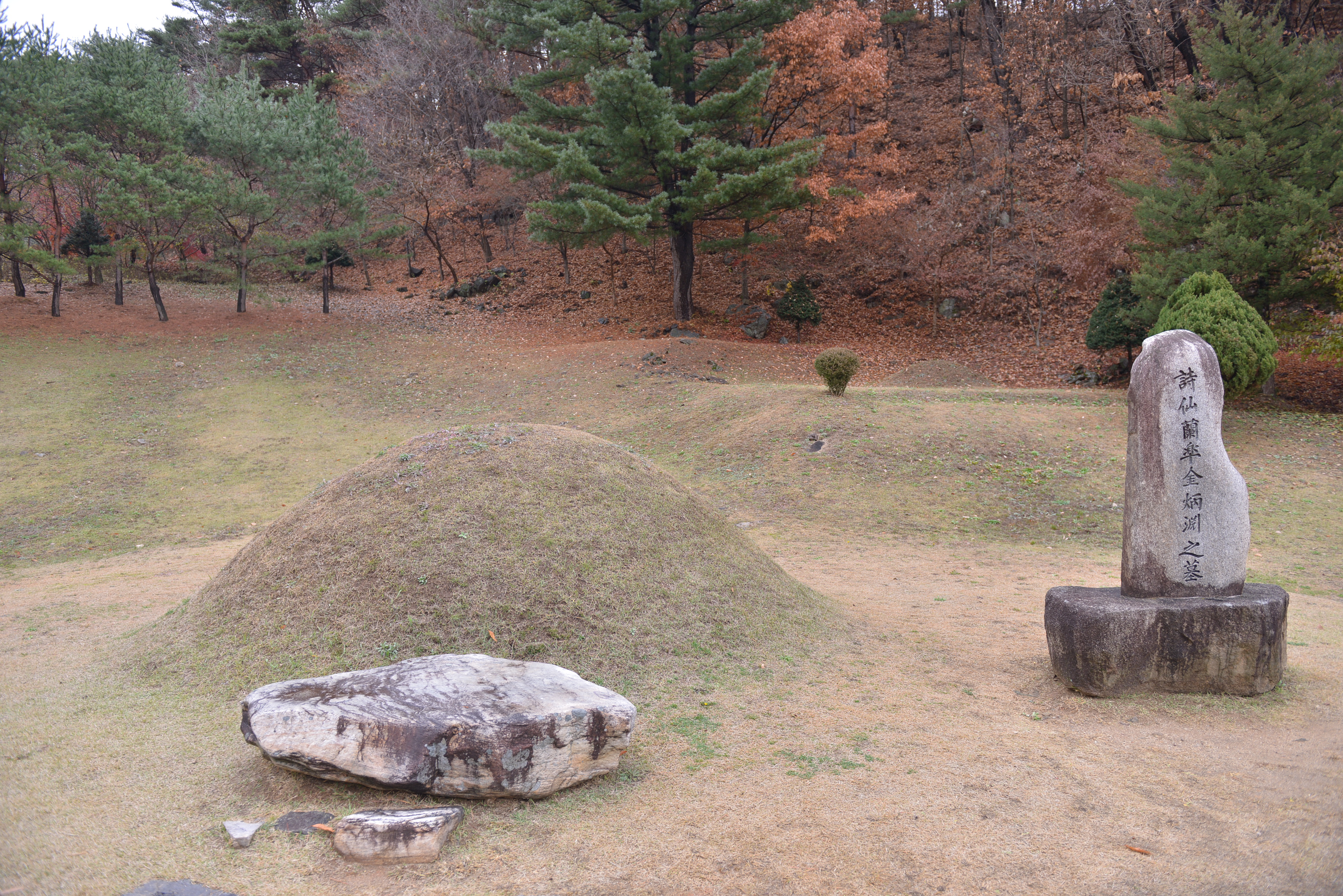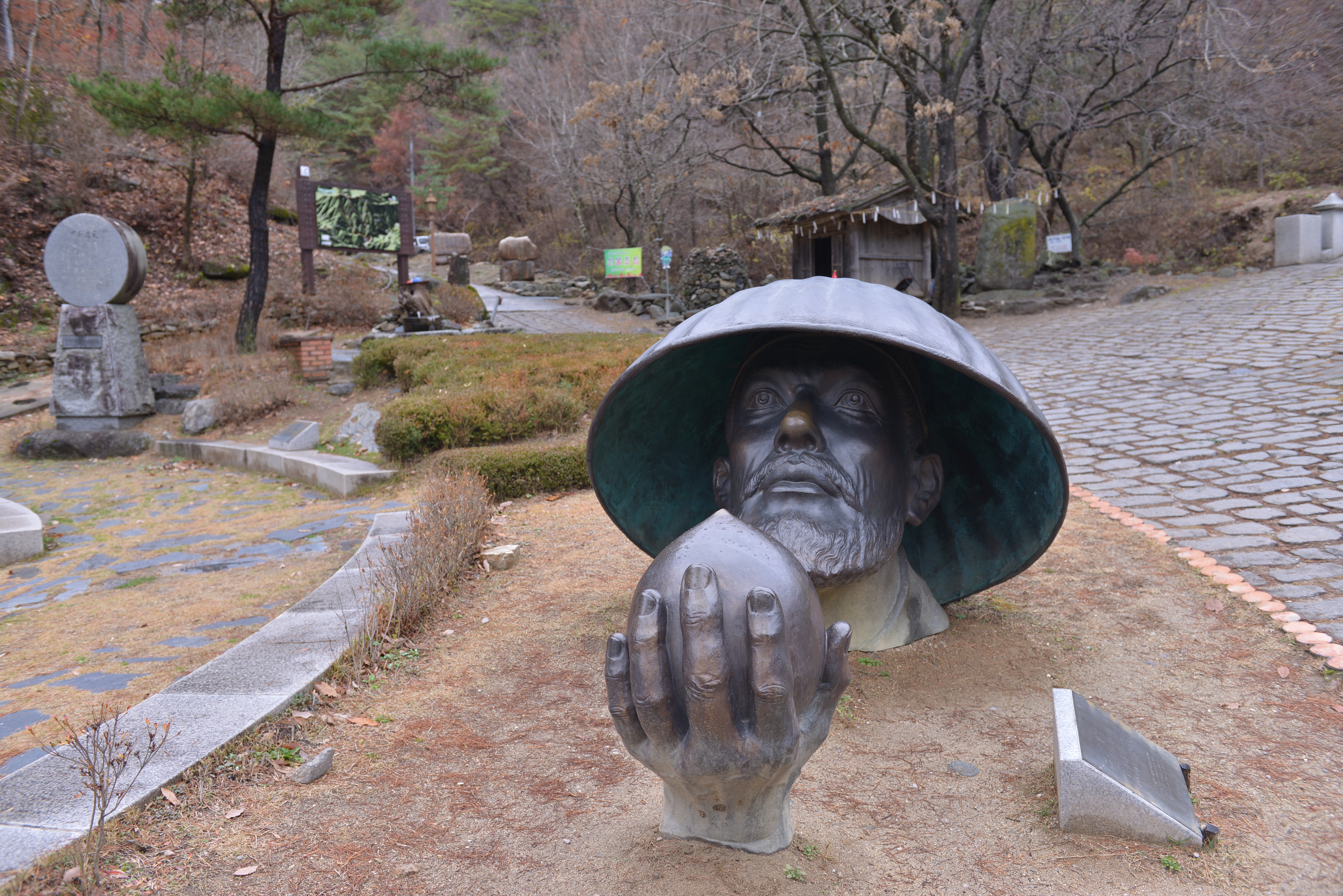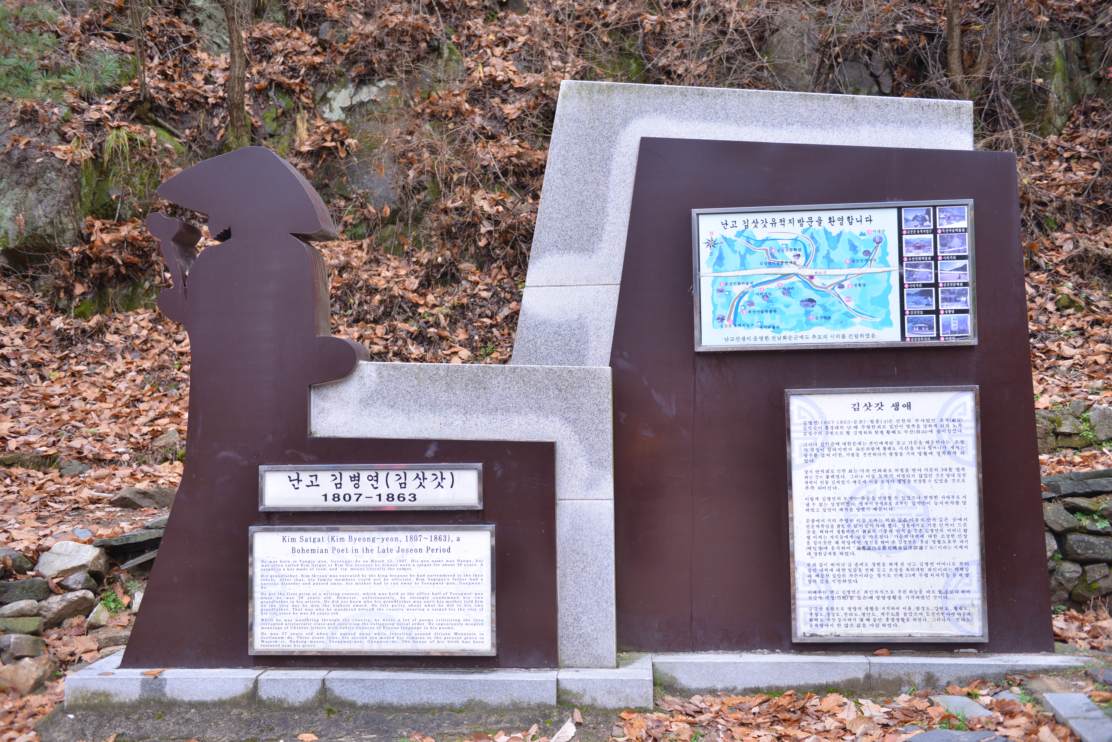 영월 김삿간면에 도착하자마자 첫 번째로 김삿삿의 묘로 향하여 현재 감삿갓의 설명으로 김삿갓의 생애와 발자취에 대하여 듣고, 내려오면서 김삿갓의 조형물들을 다시 한 번 천천히 보면서 내려 왔어요.