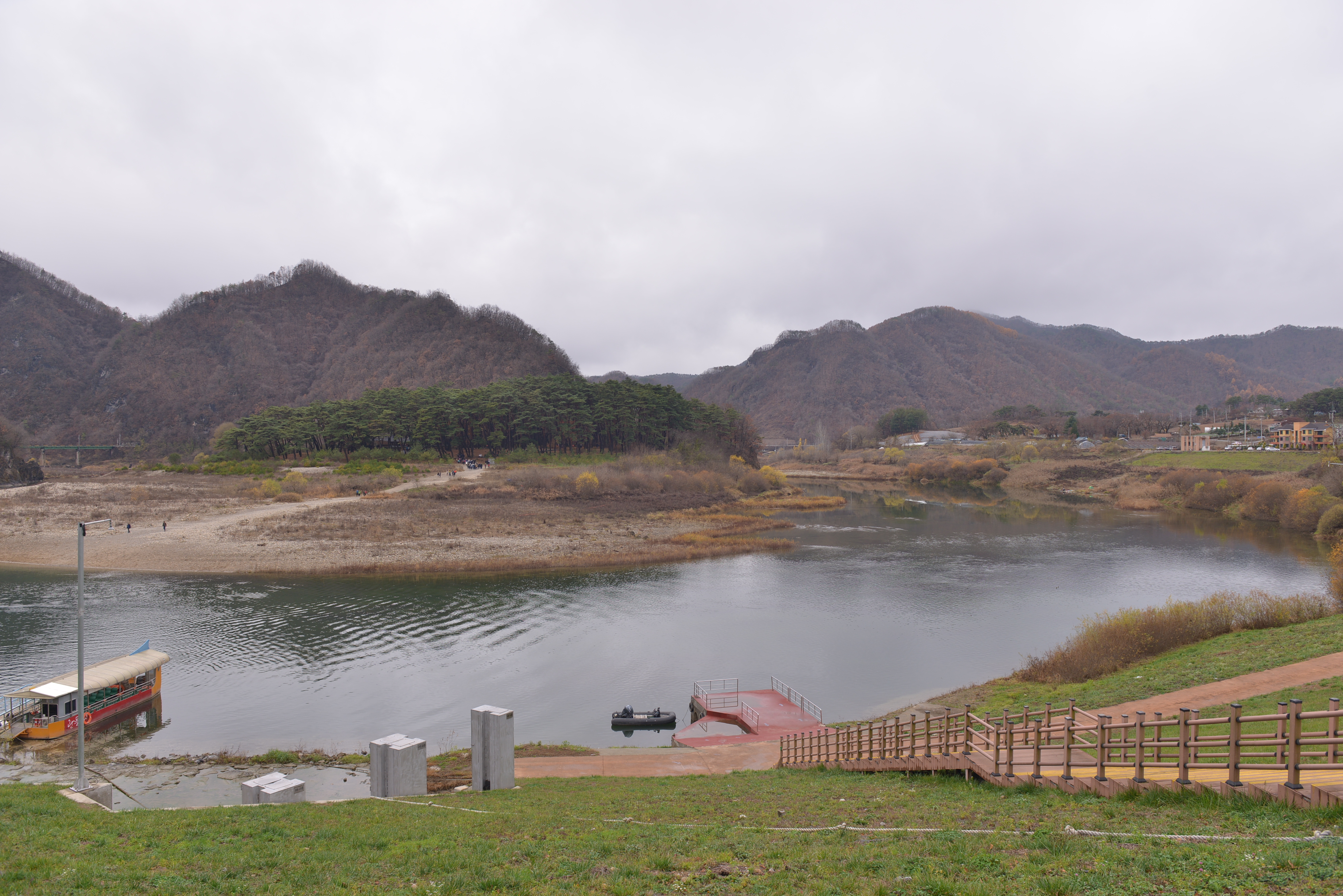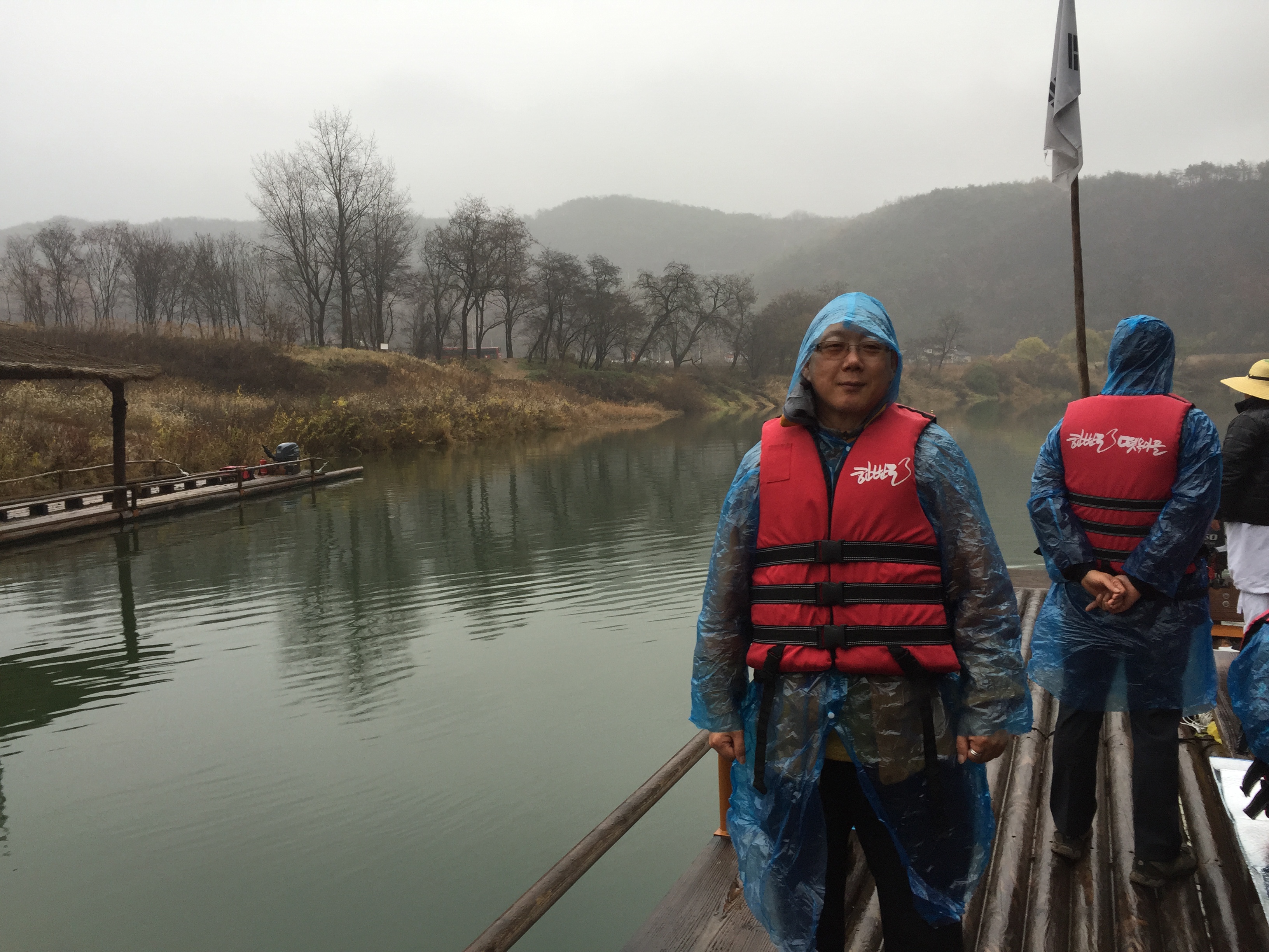 비가 내린 관계로 산등성에 올라가서 한반도는 보지 못하고 뗏목 체험 만 ... 안전우선 안전조끼 착용 후 승선 후, 날이 좀 맑았으면 좀 더 좋았을 것을 아쉬워하며,  뗏목이 천천히 가면서 주변 풍광 감상 및 스마트폰 촬영을 했습니다 ?!