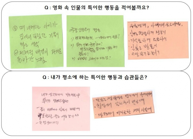 감독님께서 주신 질문에 참여자들은 포스트잇에 나만의 답을 적고, 함께 꽃차와 빵을 먹으며 영화속 인물들을