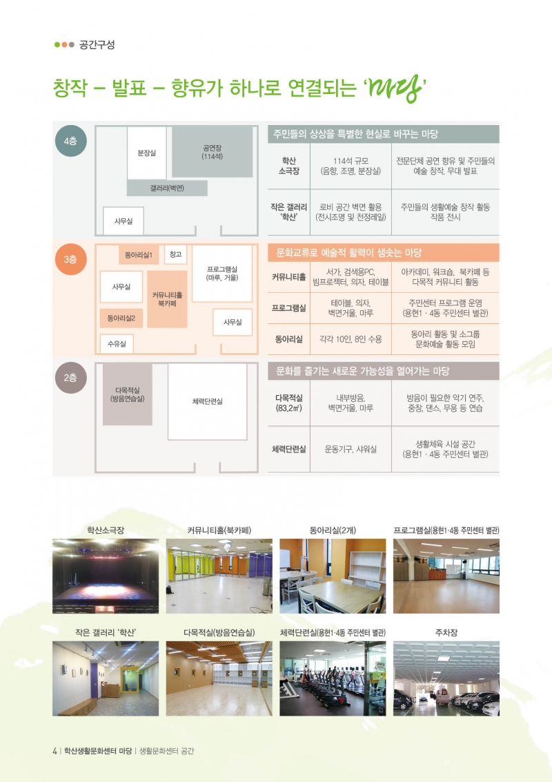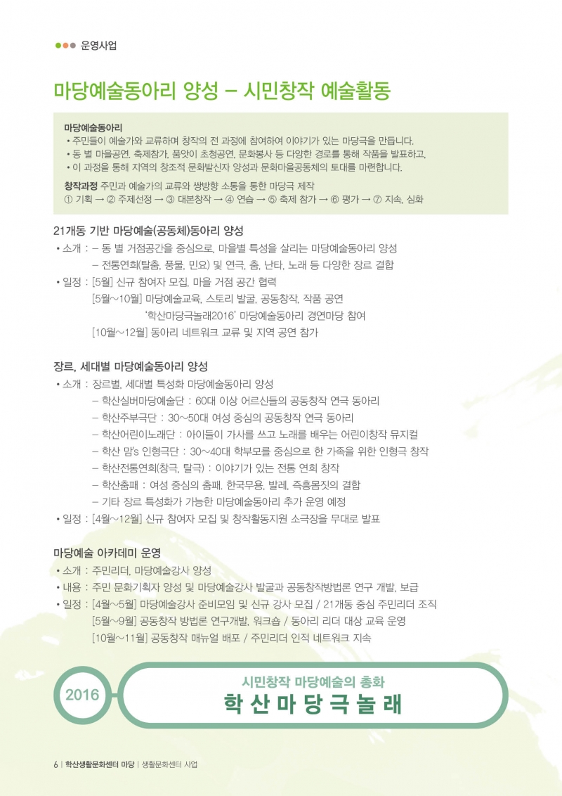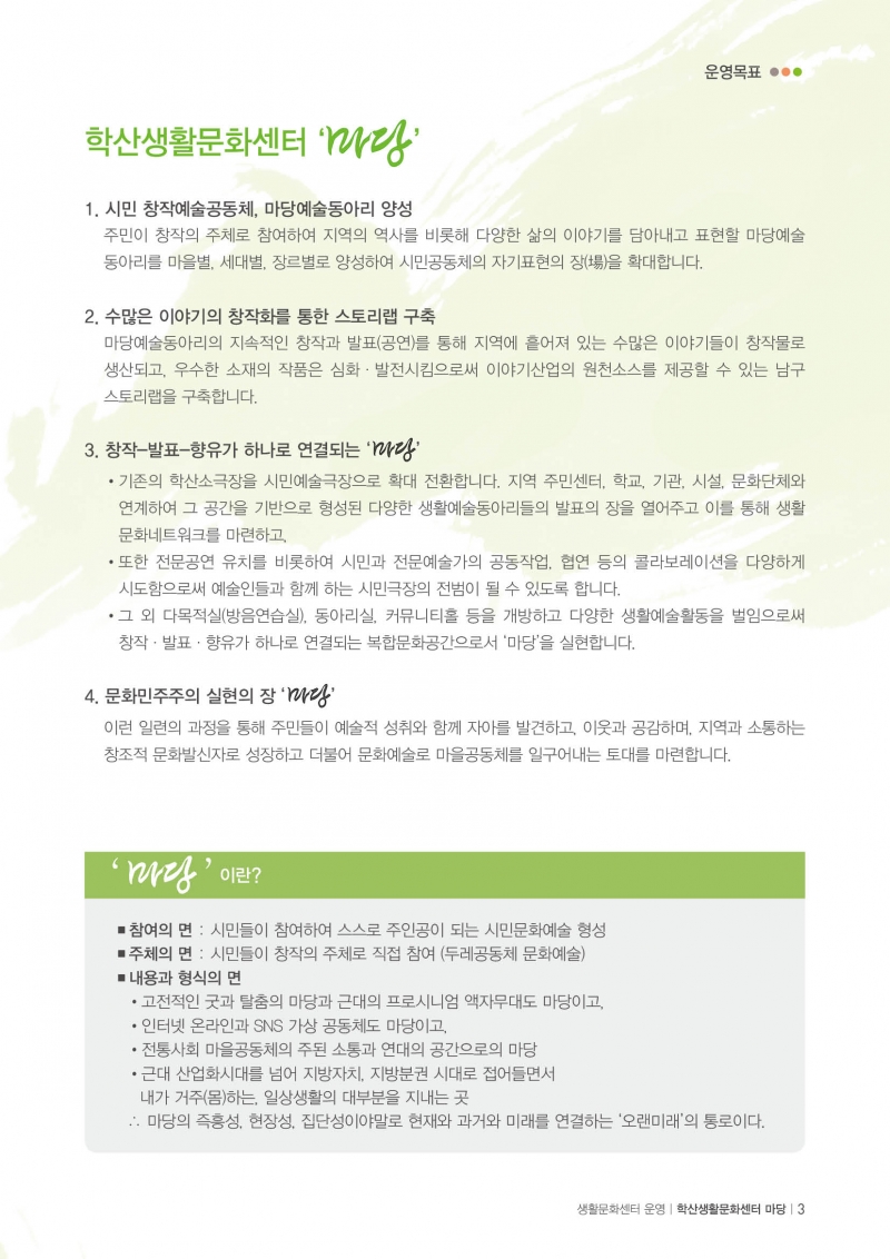 학산생활문화센터'마당'를 운영하며 시민창작예술공동체가 어우러지는 판(場)으로서의 지역문화네트워크 플랫폼을 만들어가고자 합니다.