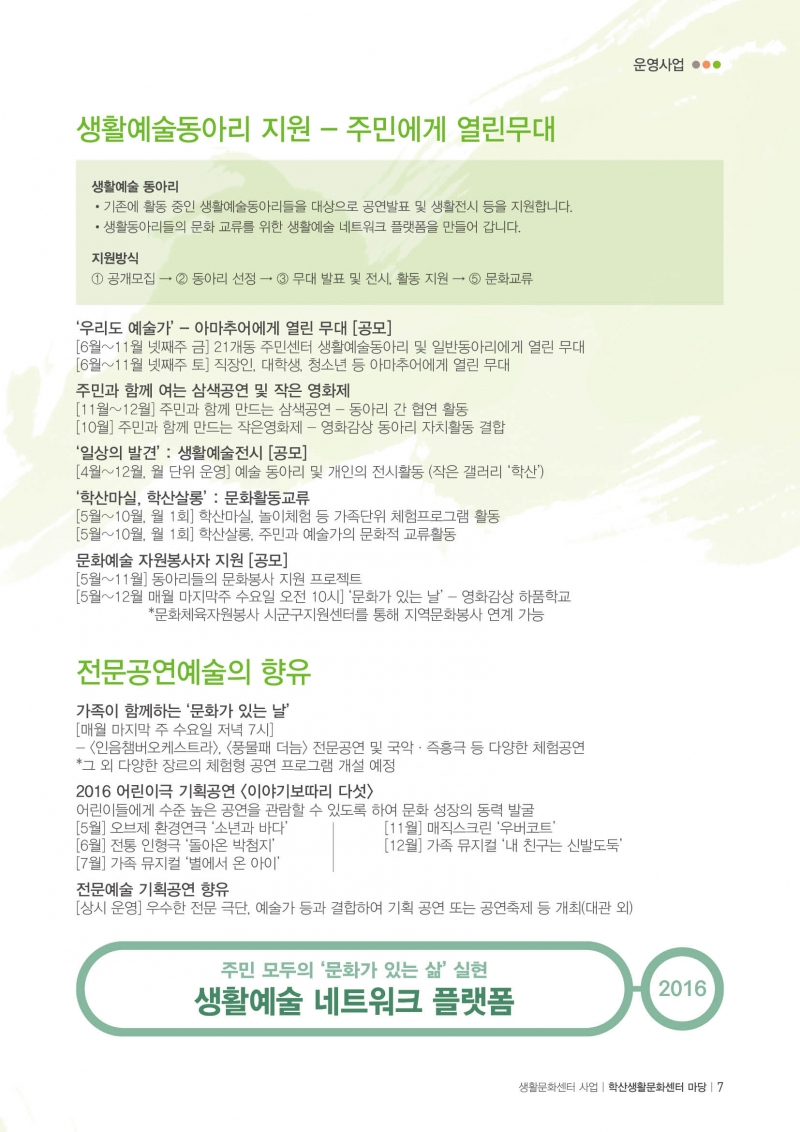 또한 누구에게나 열린 시민예술극장으로 운영되는 학산소극장에서는 클래식과 국악이 어우러지는 ‘문화가 있는 날’ 운영과 어린이극 이야기 보따리 다섯 기획공연이 준비되어 있으며, 다양한 장르의 생활동아리들의 공연 발표를 지원하는 아마추어에게 열린 무대도 준비되어 있습니다.