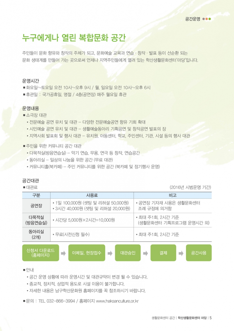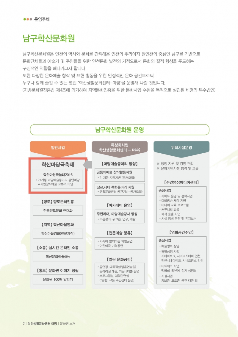 인천광역시 남구는 문화체육관광부가 주최하는 생활문화센터 조성 공모사업으로 지원받은 국비, 시비, 구비를 지원받아 기존 학산소극장과 용현1.4동 주민센터 별관을 일부 증훅하여 학산생활문화센터'마당'을 조성하였습니다.