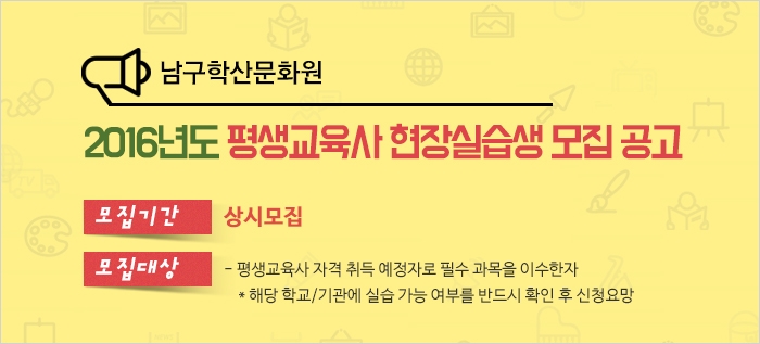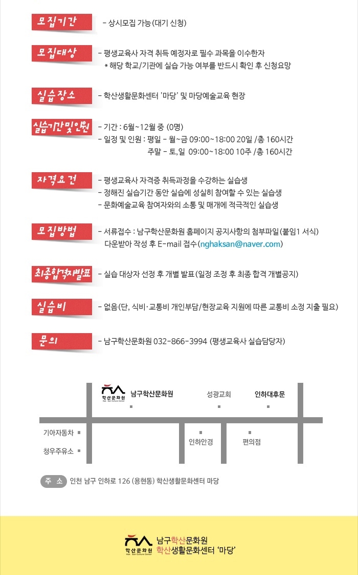 2016년도 평생교육사 현장실습생 모집 공고 학산 0 8705 2016-06-01 09:48:01 [남구학산문화원]평생교육사 실습신청서.hwp 이전글 : 개관기념 학산마실&생활전시 다음글 : 남구 21개동 숭의1.3동, 숭의2동, 주안6동, 숭의4동 마당예술동아리 모집 목록 댓글목록 이름 비밀번호 등록