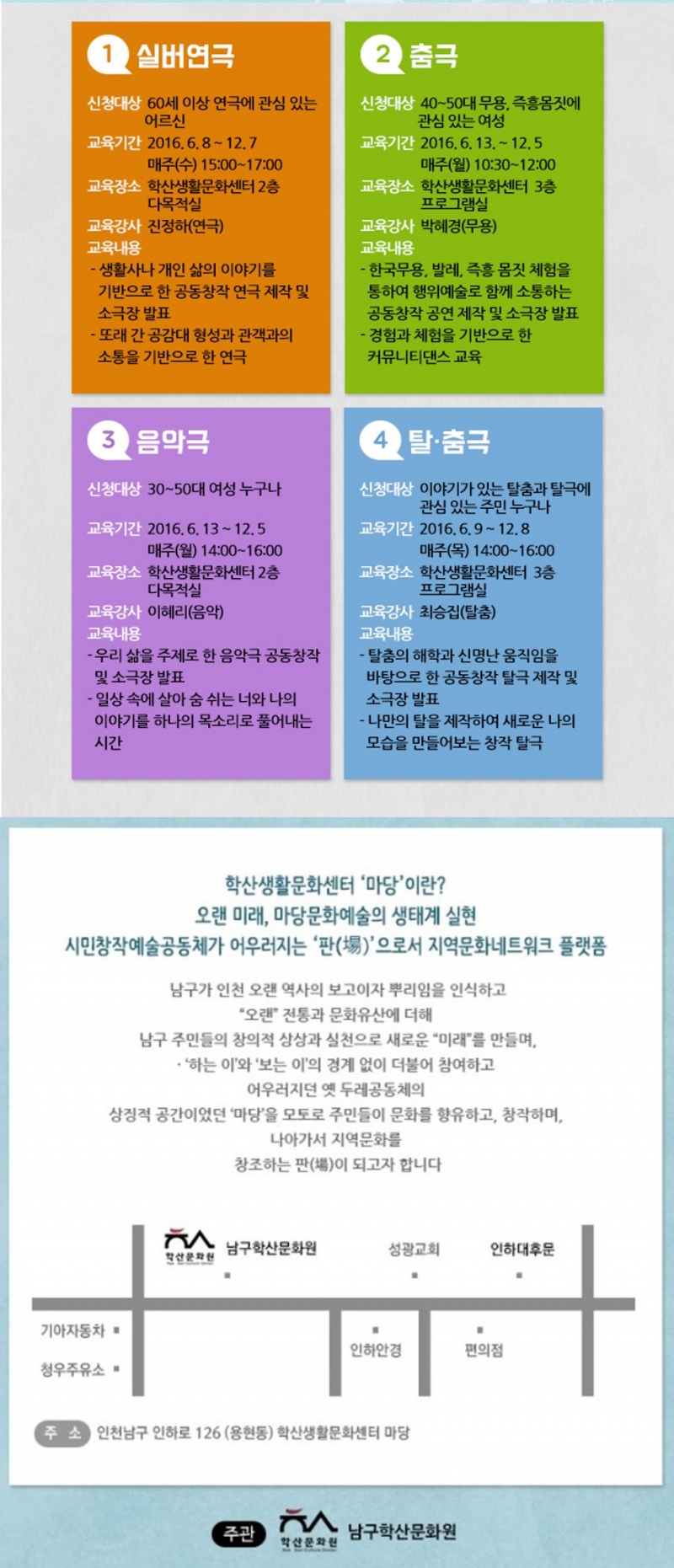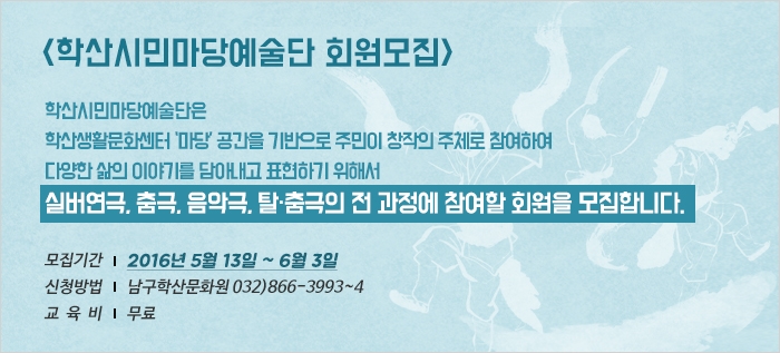 학산시민마당예술단 회원모집 삶의 이야기를 예술로 표현하다 admin 0 9263 2016-06-02 09:42:02 생활문화센터'마당'에서 주민의 이야기로 창작활동을 펼쳐갈 학산시민마당예술단 회원을 모집합니다. 관심있는 주민들의 많은 참여 바랍니다. 이전글 : 토요일, 예술로 힐링여행 다음글 : 남구 학산문화원 실버 예술단 소식 목록 댓글목록 이름 비밀번호 등록