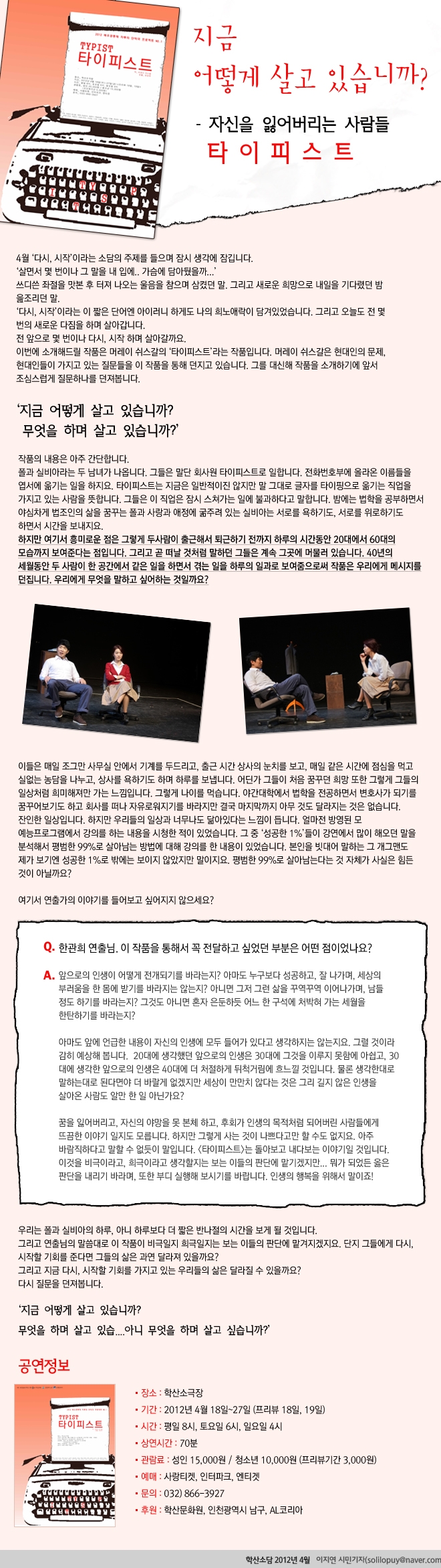 지금 어떻게 살고 있습니까? - 타이피스트 admin 0 9810 2012-04-03 10:00:24 - 이전글 : [사진전] 괭이부리마을의 낯설게 하기 다음글 : 보리 목록 댓글목록 이름 비밀번호 등록