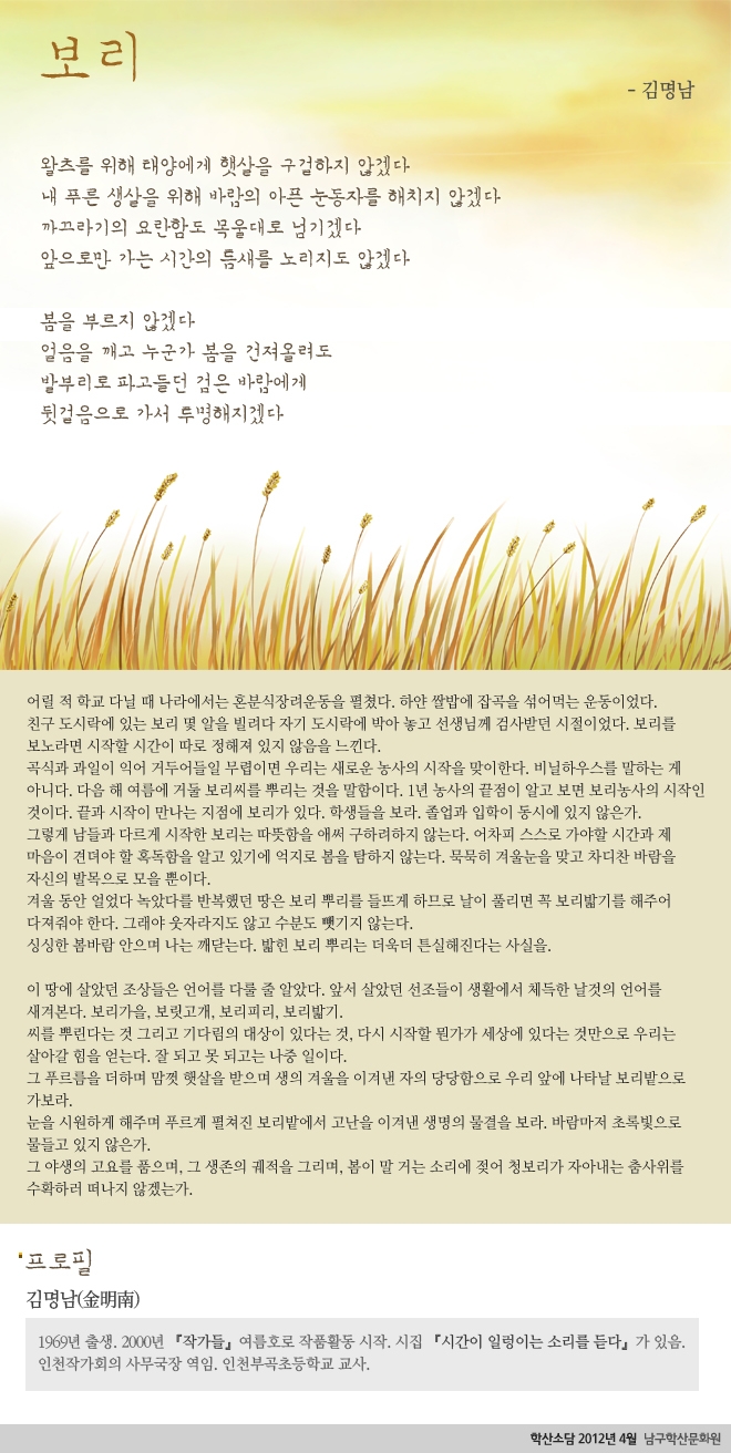 보리 admin 0 9943 2012-04-03 10:00:27 - 이전글 : 지금 어떻게 살고 있습니까? - 타이피스트 다음글 : 처음인 것처럼 혹은 마지막인 것처럼 - '달팽이의 별' 목록 댓글목록 이름 비밀번호 등록
