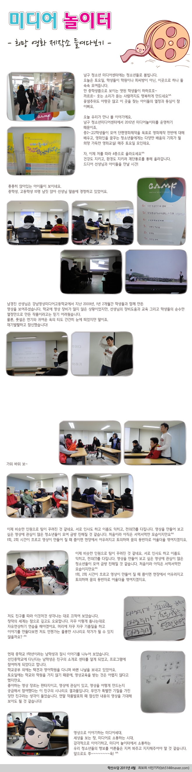 미디어 놀이터-희망영화 제작소 들여다보기 admin 0 10289 2012-04-03 10:00:26 - 이전글 : 우리동네 개성만점, 윤순자였지요! 다음글 : 우리 동네 가수 탄생 '즐거운 노래교실' 목록 댓글목록 이름 비밀번호 등록