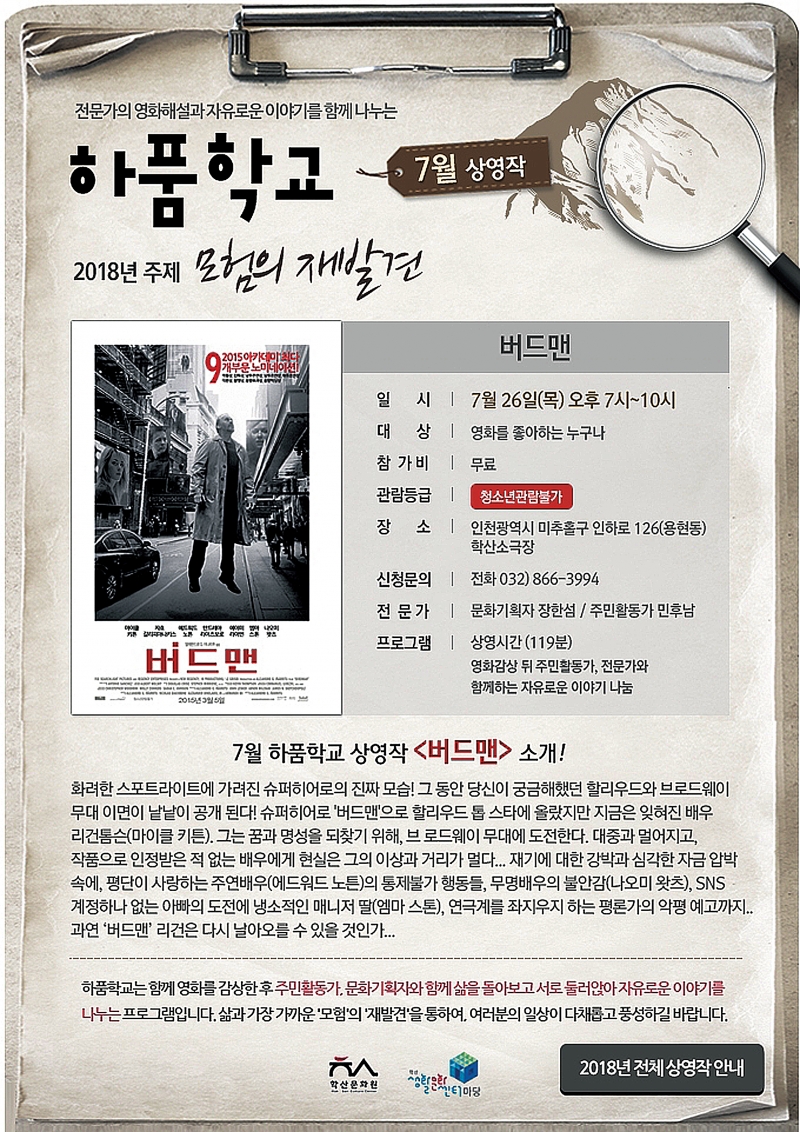하품학교는 매월 마지막주 목요일 저녁 7시에 올해의 주제에 맞게 선정된 영화 한 편을 감상한 뒤 전문가의 영화해설, 주민활동가와의 영화 토론을 통해 일상을 되돌아보는 시간입니다. 신선한 공기를 주입하는 하품처럼 우리의 일상을 깨우기 위한 의미를 가진 하품학교! 7월의 상영작 <버드맨>은 헐리우드 인기 배우의 삶을 통해 인생의 추락과 비상에 대해 되돌아보게하는 시간이었습니다.