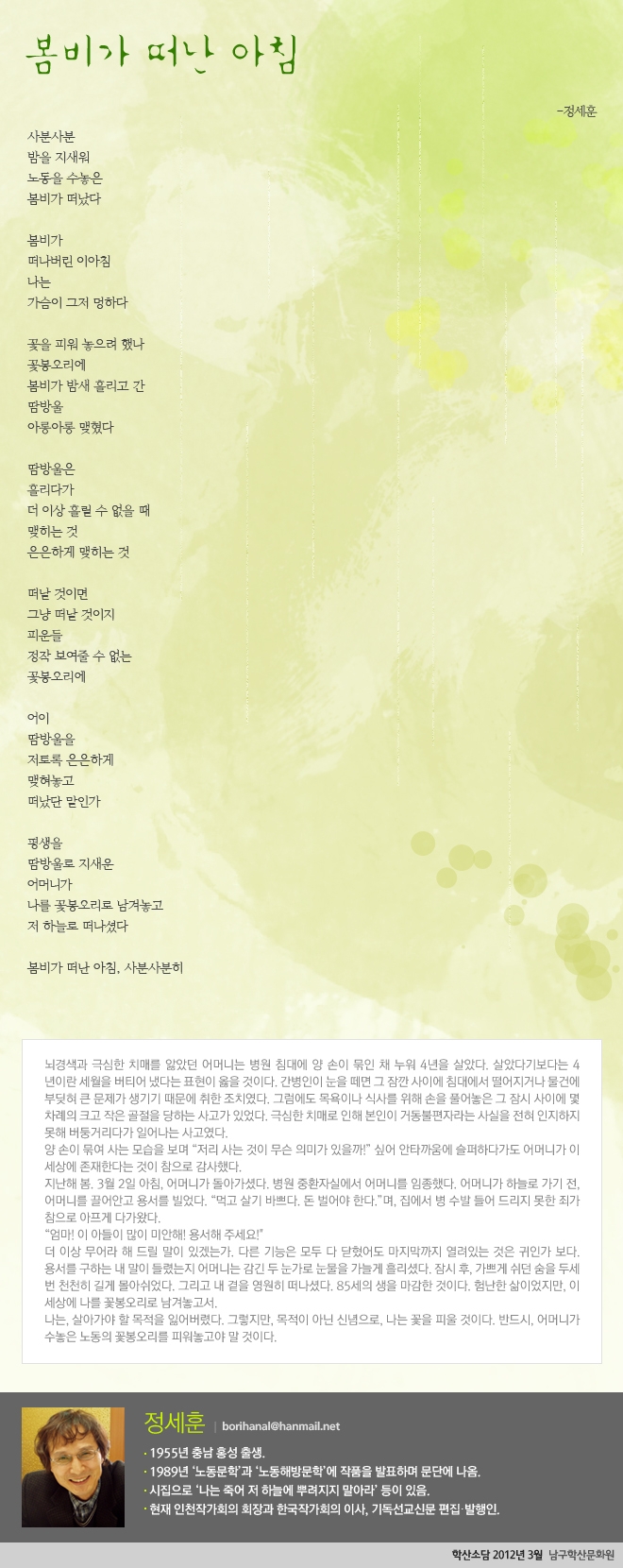 봄비가 떠난 아침 admin 0 10446 2012-03-06 10:00:46 이전글 : 신바람 어르신들, 이팔청춘 예쁜 꽃으로 피어나다 다음글 : 뜨거운 사랑은 쉽게 지친다 '아티스트' 목록 댓글목록 이름 비밀번호 등록