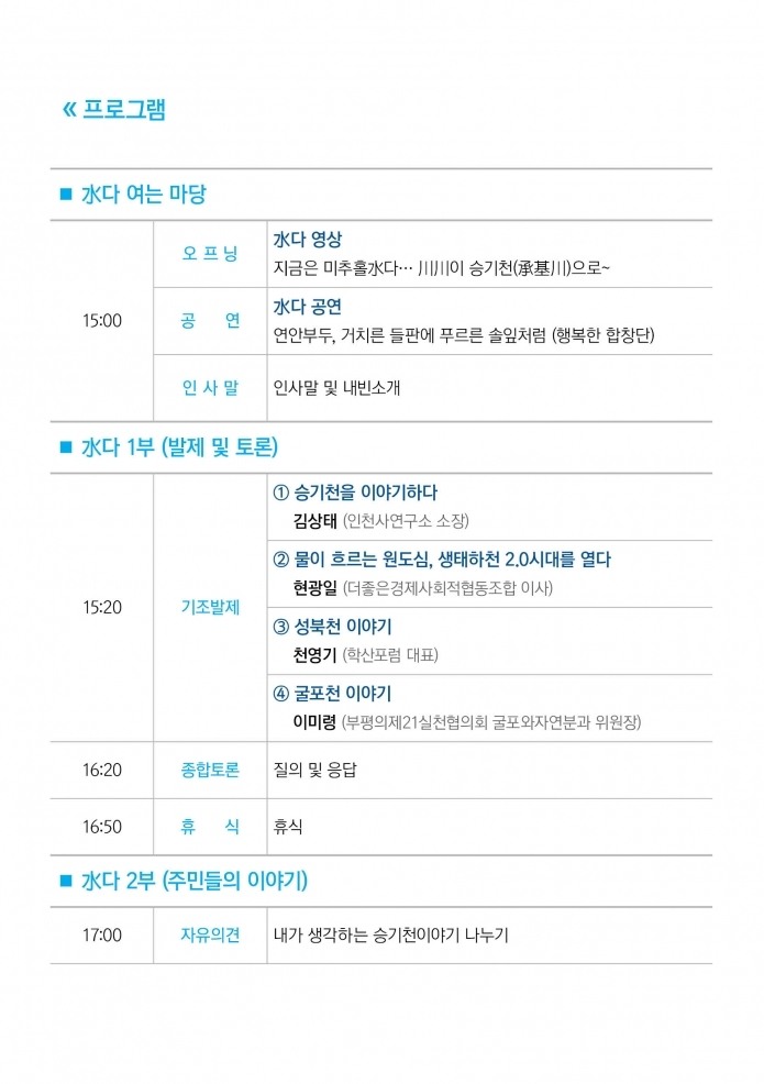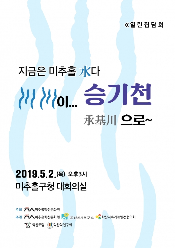 열린집담회 - 지금은 미추홀 水다 – 川川이 승기천(承基川)으로 - 주민들과 함께 하는 열린집담회 미추홀학산문화원 0 10176 2019-04-23 10:03:19 이전글 : 2019 학산어린이극 5월 공연 다음글 : 학산생활문화센터 시민극단 참여자 모집 목록 댓글목록 이름 비밀번호 등록