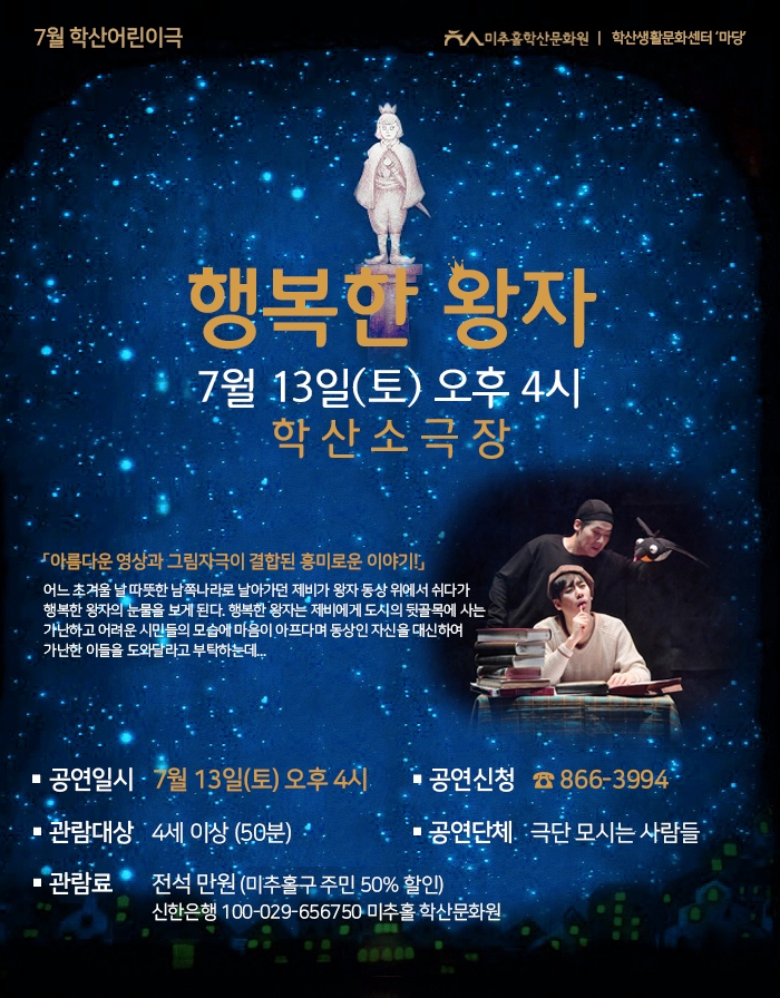 2019 학산어린이극 7월 공연 연극 \'행복한 왕자\' 학산생활문화센터 0 8757 2019-06-22 20:39:05 이전글 : 동네인형놀이단 참여자 모집 다음글 : \"동양고전 배우는 맛에 여름 더위는 물러갑니다\" 목록 댓글목록 이름 비밀번호 등록