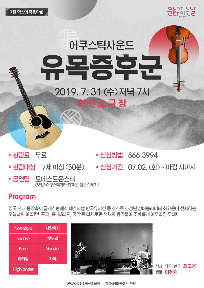 2019 학산가족음악회 7월 공연 어쿠스틱사운드 \'유목증후군\' 학산생활문화센터 0 8796 2019-07-02 20:27:25 이전글 : 인문독서아카데미 - 과학, 인문과 공명하다 다음글 : 용현5동 마당예술동아리 <우날스> 목록 댓글목록 이름 비밀번호 등록