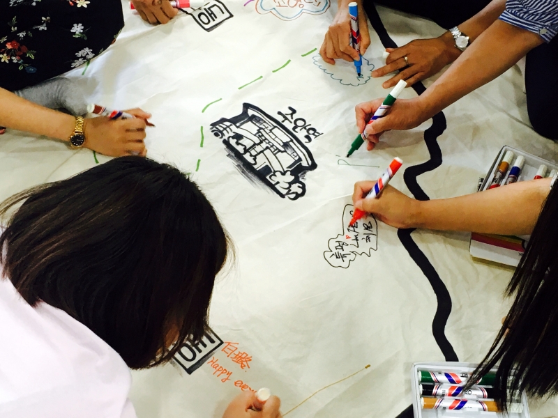 그리고 네 명씩 팀을 이루어서 상황극을 만들었는데요, 정말 섬세한 표현에 선생님은 물론 지켜보는 사람들 모두 깜짝 놀랐답니다. 성형외과를 표현한 A팀은 의자에 앉은 환자 눈과 코에 라인을 그리고, 언제쯤 수술할 지 정하는 연기를 했는데요! 성형외과에 문의하신 적 있냐는 질문이 나올 정도로, 병원 그 자체였습니다.