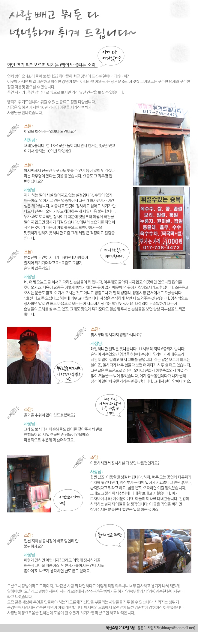 뻥이오~! 사람빼고 뭐든 다 넉넉하게 튀겨 드립니다~ admin 0 10804 2012-03-06 10:00:43 이전글 : 뜨거운 사랑은 쉽게 지친다 '아티스트' 다음글 : 어려워도 행복하던 시절 목록 댓글목록 이름 비밀번호 등록