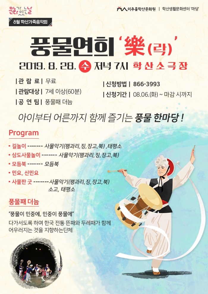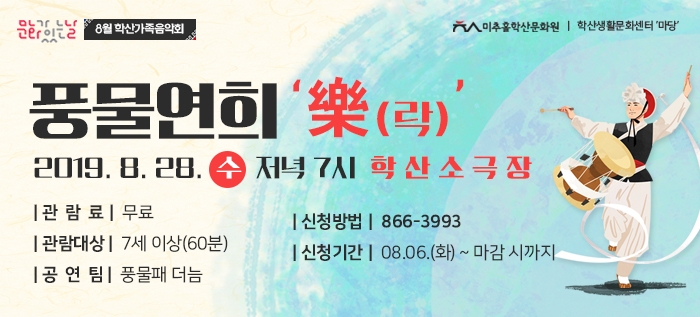 8월 학산가족음악회 \'풍물연희 락\' 정유진 0 8878 2019-08-07 15:57:04 이전글 : 8월 시민에게 열린무대 \'우리도 예술가\' 다음글 : 8월 학산어린이극 공연 목록 댓글목록 이름 비밀번호 등록