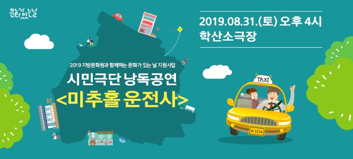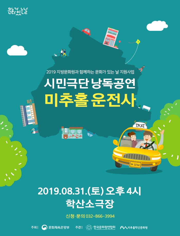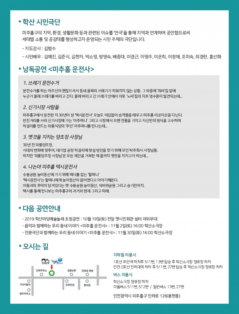시민극단 낭독공연 <미추홀 운전사> 2019 지방문화원과 함께하는 문화가 있는 날 지원사업 admin 0 8831 2019-08-21 14:42:11 이전글 : 미추홀학산문화원 공연 서포터즈 1기 모집 다음글 : 학산소극장 공연관람 후기 이벤트 목록 댓글목록 이름 비밀번호 등록