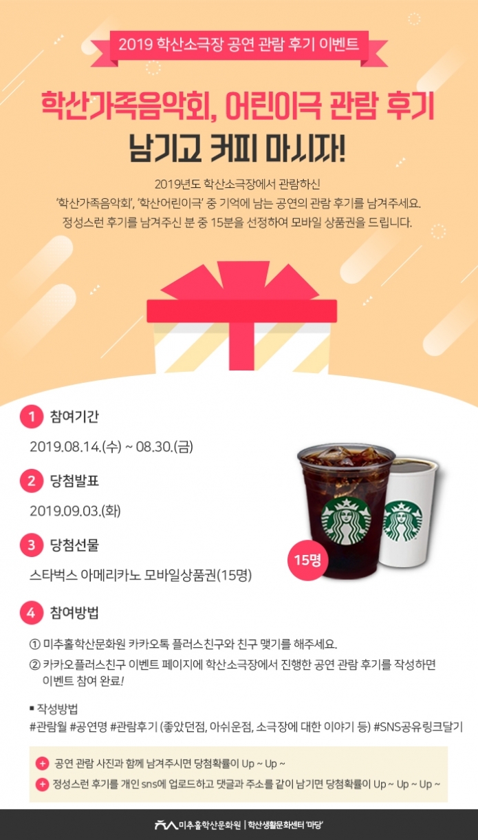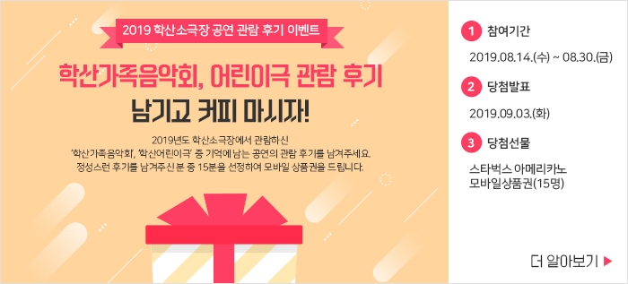 학산소극장 공연관람 후기 이벤트 학산가족음악회, 어린이극 공연 관람 후기 쓰고 커피 마시자! 정유진 0 9026 2019-08-14 17:01:23 참여하기 ► http://pf.kakao.com/_tGxcIj/38780159 이전글 : 시민극단 낭독공연 <미추홀 운전사> 다음글 : 9월 학산어린이극 공연 목록 댓글목록 이름 비밀번호 등록
