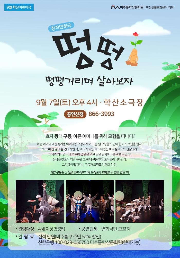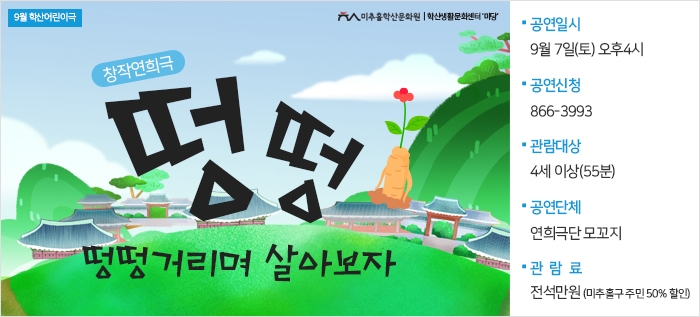9월 학산어린이극 공연 떵떵-떵떵거리며 살아보자 정유진 0 8635 2019-08-17 09:58:26 이전글 : 학산소극장 공연관람 후기 이벤트 다음글 : 8월 우리도예술가 공연 목록 댓글목록 이름 비밀번호 등록