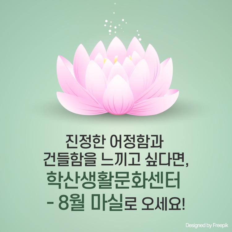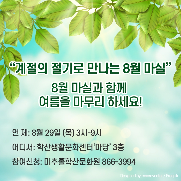 계절 변화를 알리는 알람 "절기" 진정한 어정함과 건들함을 느낄 수 있는 8월 마실 admin 0 9050 2019-08-23 11:32:06 이전글 : 미추홀구 얼마나 알고 있나요? 다음글 : 그곳이 알고 싶다 - 학산생활문화센터 \'마당\' 목록 댓글목록 이름 비밀번호 등록