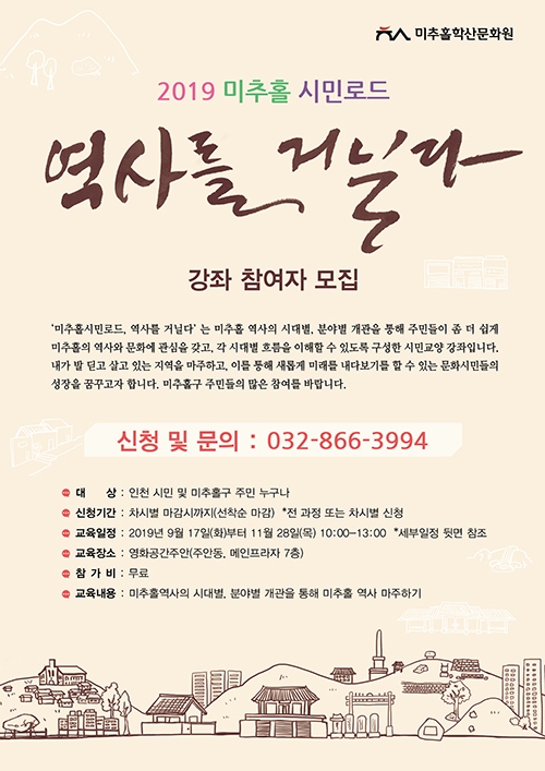 미추홀학산문화원은 오는 17일부터 11월28일까지 학산문화원 3층 프로그램실에서 '2019 미추홀 시민로드, 역사를 거닐다' 강좌를 진행한다고 2일 밝혔다.