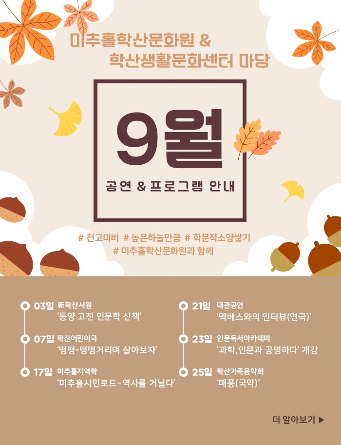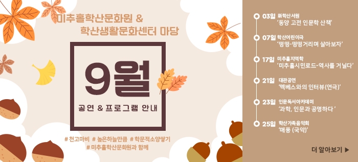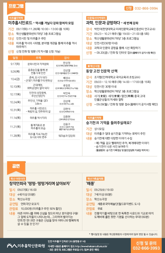 9월 공연·프로그램 안내 admin 0 9085 2019-09-03 16:35:45 이전글 : 학산가족음악회"풍물연희 樂" 다음글 : 낭독공연 <미추홀 운전사> 관람 후기! 목록 댓글목록 이름 비밀번호 등록