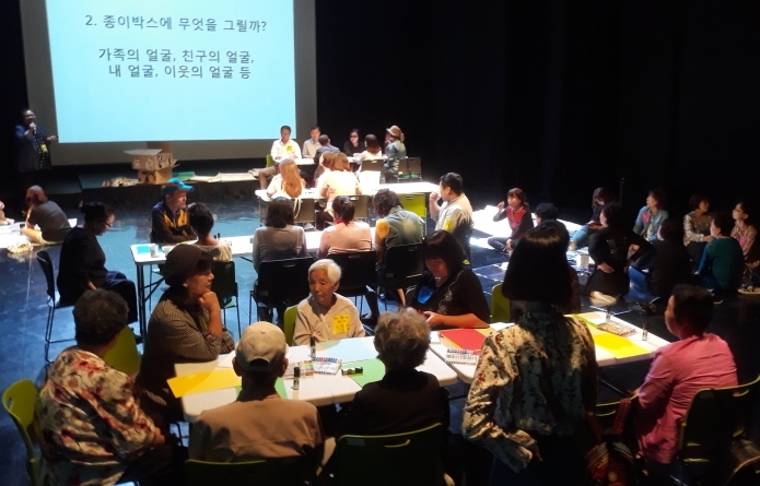 2부 공동미술작업 시간에는 팀별로 재활용 골판지박스에 그림을 그려 넣은 후 조형물로 재창조하는 작업이 진행됐다. 팀별로 개성넘치는 그림이 그려진 각양각색의 골판지 조형물은 이들이 무대에 오르는 마당극 공연 현장에 전시될 예정이다.