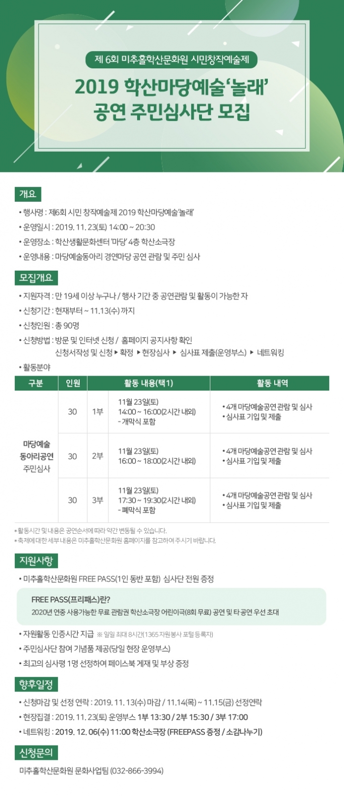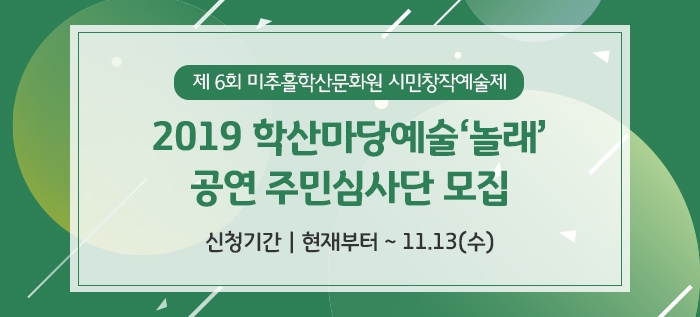 2019 시민창작예술제 학산마당예술 '놀래' <주민심사단 모집> admin 0 9385 2019-11-06 10:20:03 이전글 : 계절의 절기로 만나는 - 10월 마실 다음글 : 미추홀 지역 사람들의 기억을 모아가는 \'미추홀 시민기록자\' 목록 댓글목록 이름 비밀번호 등록