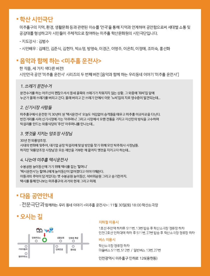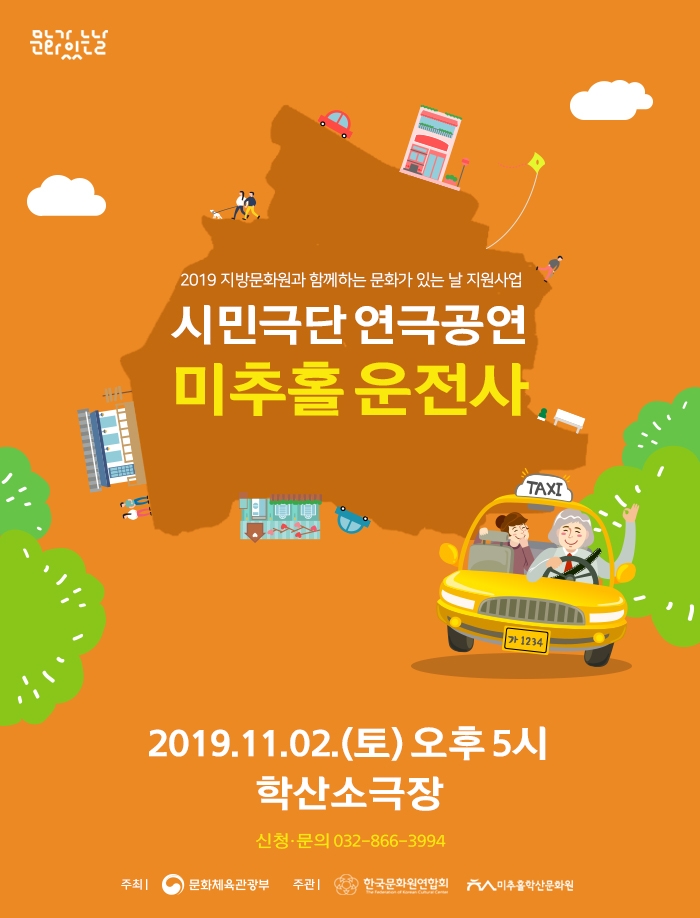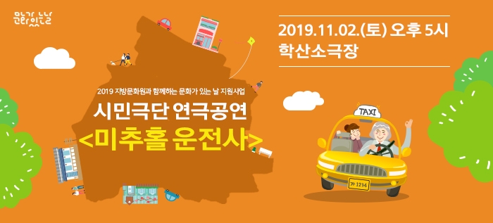 음악과 함께 하는 시민극단 연극공연 <미추홀 운전사> 2019 지방문화원과 함께하는 문화가 있는 날 지원사업 admin 0 9275 2019-11-06 10:18:59 이전글 : 미추홀 지역 사람들의 기억을 모아가는 \'미추홀 시민기록자\' 다음글 : 시민에게 열린무대 <우리도 예술가> 목록 댓글목록 이름 비밀번호 등록